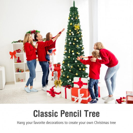 This artificial Christmas tree features a slim pencil design that is perfect for display in corners small rooms and areas with minimal floor space. It features simple green color branch tips design to help emulate a real Christmas tree. The tree is made of fade and crush resistant PVC needles appear fresh-cut. In addition the staggered branches give the tree a fuller profile. High-density metal bases to keep the tree planted in an upright position. The tree adds a touch of nature to your home year-round. If you are looking for a Christmas tree like this don't hesitate to buy it! Slim pencil design is great for display in corners small rooms and areas with limited floor space Made of dense PVC needles providing it with a fresh cut look that will last all season The sturdy iron base provides the tree greater support and prevents the base from breaking Simple green color and branch tips design to help emulate a real Christmas tree Disassembles into several sections to allow for easy assembling dismantling and storing Get festive and use this tree for the holidays or add a touch of nature to your home year-round