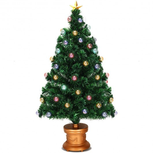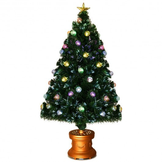 This is a user-friendly Christmas tree that comes with a LED light and golden base. There are 41 colorful balls fiber optic filaments decorated between the branches and a golden star at the top which has lights and also changes continuously like the rest of the lights after power on. A universal transformer fits the majority of countries. With these features it looks very elegant even without ornaments. The principle of its lights is very simple. The light source emitted from the golden base is used to refract the optical fiber for a colorful luminous effect. It is perfect for those who don�t want to spend too much time on a tree but still desire to add some festive glow at home. Its compact size enables you to fit it even in small spaces such as apartments dormitories rooms offices etc. This Christmas do not hesitate to get this user-friendly Christmas tree! 4 Ft tall small size Christmas Tree fits small space Features a golden base instead of a stand LED light source from the golden base After powering on the fiber optic filaments decorated between the branches will flash with various colors of light The tree comes with a golden star at the top which has lights and also changes continuously like the rest of the optics 41 multicolored balls for enough decoration UL-certified universal transformer fits the majority of countries in the world Can be easily assembled within 5 minutes