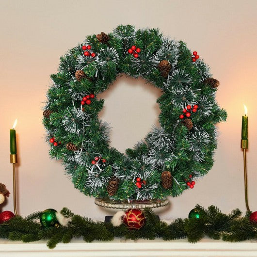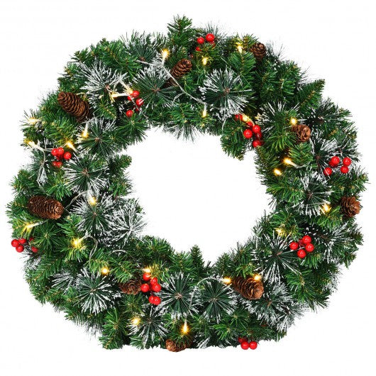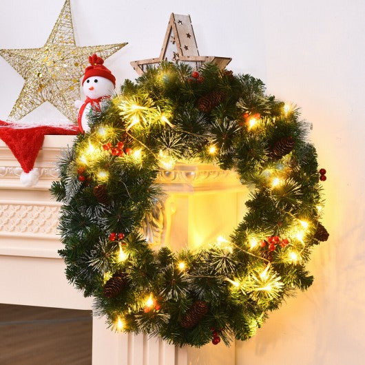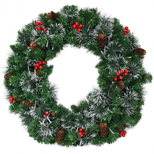 This is 24" pre-lit Christmas wreath which combines stunning warm lights and exquisite craftsmanship to bring festival atmosphere and fun. Designed with 220 tips and decorated with pine cones and red berries the artificial wreath offers you an elegant and natural appearance. Featuring 50 warm white LED lights there is no doubt that it will be the most eye-catching scene in the room. It�s worth mentioning that 8 flashing modes allow you to adjustable the lighting effect as you like. Cordless design makes it convenient for you to carry and store the brilliant wreath. Whether for your home courtyard or for commercial places like shops the pre-lit wreath is the perfect eye-catching decoration to add multiple fun and festive holiday fullness! If you are looking for a pre-lit Christmas wreath don't hesitate to buy one. Pre-installed with 50 warm white LED lights for a brilliant shine Designed with 8 flashing modes for multi lighting effects Crafted with 220 branch tips for leafy and realistic appearance Decorated with pine cones red berries and bristle tips to offer a touch of nature Non-flammable and durable PVC material not easily deformed Battery power supply convenient for movement Metal Frame for stability allows you to hang it easily Eye-catching addition for homes office shops and other business places Match any style of the room add a rich Christmas atmosphere to you