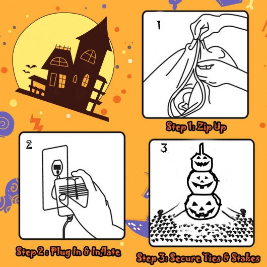 Specification: Color: As the pictures show Material:190T polyester fabric Product dimension: 5ft high Product weight: 2.2 lbs Voltage:110V/60HZ Wire Length: 9.3FT Package includes: 1 x Inflatable3-pumpkin stack 2 x Ground stakes 2 x Tether ropes 1 x Fan 1 x Adaptor
