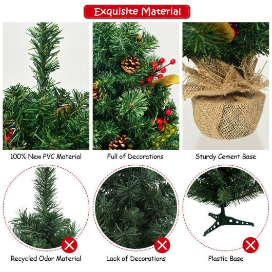 This miniature artificial tabletop tree is measured just 2FT and is perfect to bright your room table office desk and any small space. It features classic green color and rich red berries leaves and vivid pine cones to help emulate a real Christmas tree. The classic Christmas tree comes with a cement base for overall stability. No assembly required and all you need to do is put your favorite decorations on the tree. Let this Christmas tree add some festive joy to your home! The mini size design makes it easy to carry and store The bottom linen cloth has a good festival decorative effect PVC material makes the branches look real and full Sturdy cement stand provides greater support and ensures overall stability Rich tips made of PVC emulate a real Christmas tree Create a festival and enjoyable Christmas atmosphere Perfect for indoor decoration suitable for homes offices etc