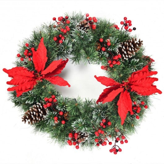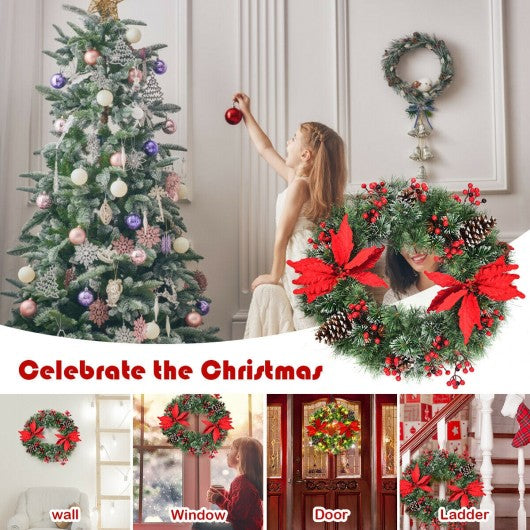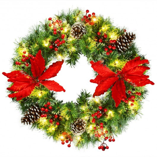 It composes flocked needles white-tipped pine cones red berries and poinsettias flowers combines different Christmas colors and delivers eye-catching design. Pre-strung with 50 warm LED lights which are controlled by 6-hour on a timer the Christmas wreath is capable of brightening up your house to let you be immersed in festival atmosphere. It is fairly easy for you to decorate the home with the wreath since it is fully assembled. And you can hang it on the wall window stair door and any more places as per your preference. it is worth mentioning that the wreath is made of 100% new PVC material superior to the recycled material in color and texture which is also odor-free for safe home use. If you are looking for this product don't hesitate to place an order! 50 Pre-Strung LED lights light up your house for a warm festival atmosphere Battery operated with integrated 6 hours on/18 hours off timer Trimmed with poinsettias red berries flocked needles and white-tipped pine cones for an eye-catching look 100% New high-quality PVC material odor-free ultra-durable Can be hung on the wall window stair front door and more places 24" Diameter with 113 branch tips No assembly required save you time and energy