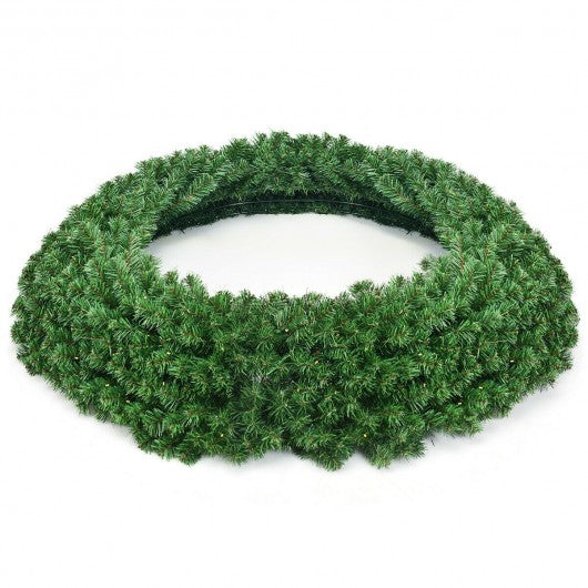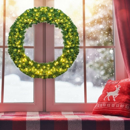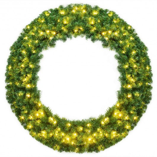With a nice lighting effect from the pre-lit Christmas wreath you can get into the joyful Christmas spirit having a happy Christmas time. It composes 714 tips and circular shape that deliver life like design with full lush look. Compared with wreath made of recycled material it features bright green color delicate texture and good fade resistance since it is crafted from the 100% new high quality PVC material. Odor free and non-allergic wreath also frees you from the worry about using safety which shall be a family-friendly decoration in the Christmas season. You can decorate your home by hanging it on your house beam front door wall or even the large window anywhere you want. When not in use it can be disassembled into 2 pieces to bring much more convenience in storage for better usage year after year. Let's have a happy Christmas with the pre-lit Christmas wreath! 200 warm white LED lights brings star-like lighting effect in the darkness Battery operated with integrated 6 hours On/18 hours Off dual timer 48 -inch Christmas wreath 714 branch tips with full shape and lush look 100% New premium PVC new material non-flammable non-allergic and odor free Comes with 2-pices semicircular wreath ring for easy assembly in short time Convenient storage lasting durability for long-term use year after year Suitable for indoor and outdoor decorate house beam window wall and front door Bring the Christmas atmosphere to any place you hang the wreath