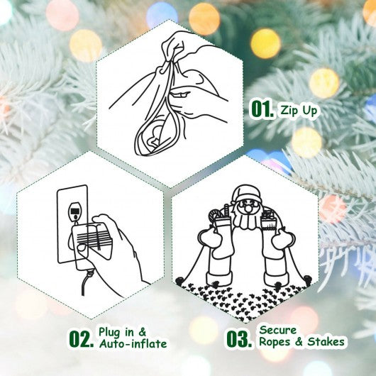 This Christmas inflatable decoration is waterproof and durable which is suitable for indoor and outdoor use. It is equipped with built-in LED lights that grab your guest�s attention while making every night unique. Thanks to its sandbag 6 ropes and 6 stakes this inflatable Christmas decoration is very stable on windy and snowy days. It has a waterproof fan so that inflation is very fast after plugging in. And deflation is quite easy for easy storage. Are you still bothering to find suitable Christmas decorations? This inflatable Christmas Santa riding polar bear with shaking head is the perfect choice for you! Are you looking for a Christmas inflatable decoration like this do not hesitate to place an order. Inflates quickly with a waterproof fan Uses zipper to deflation for easy storage Suitable for home yard garden and party Waterproof polyester fabric for long time use Perfect decoration for your precious Christmas Makes every night unique with shiny LED lights Built-in sandbag 6 ropes and 6 stakes for stability Cute appearance with shaking head grabs guests' attention
