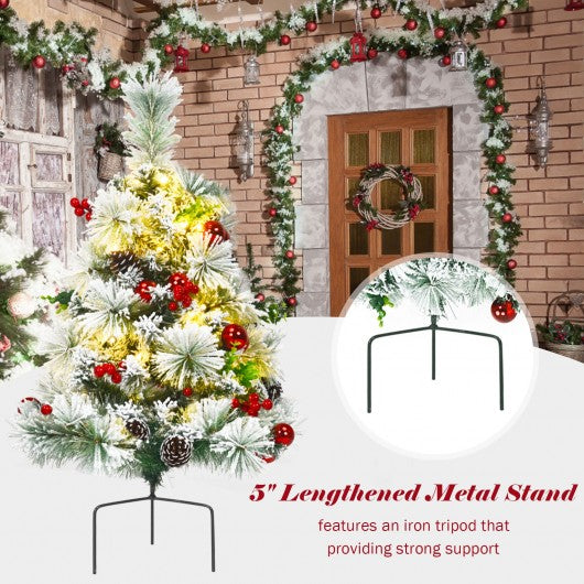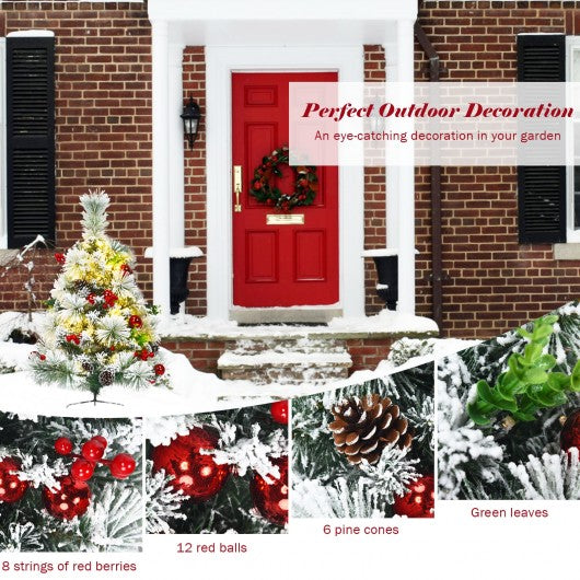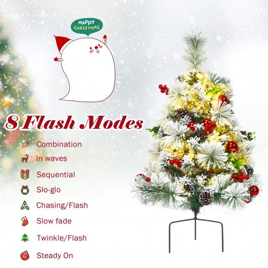 Celebrate Christmas in style with this pathway pre-lit Christmas trees. Made of high quality PVC material these exquisitely crafted leaves with white floss will not fall off or fade easily. The solid iron tripod can be deeply inserted into soil thus providing strong support. Besides there are 6 pine cones 12 red balls and 8 strings of berries on the tree. Powered by 3 AA batteries this small artificial Christmas tree comes with 30 warm LED lights that have 8 flash modes. In addition the battery powered design allows you to conveniently place these Christmas trees on the ground. With their elegant appearance these pre-lit pathway Xmas trees will out of question be the focal point in your garden. If you are looking for a product like this. Don't hesitate to buy it! Snow flocked leaves and vivid ornaments help emulate a real pine tree Rich ornaments adds more fun to festival decoration 8 different light modes help create a unique festival atmosphere Battery powered design frees you from the messy cord to place it outside High-quality PVC branch tips with exquisite craftsmanship will not fall off or fade easily Lengthened solid metal stand keeps the Christmas tree standing upright all season Eye-catching addition for homes and communities
