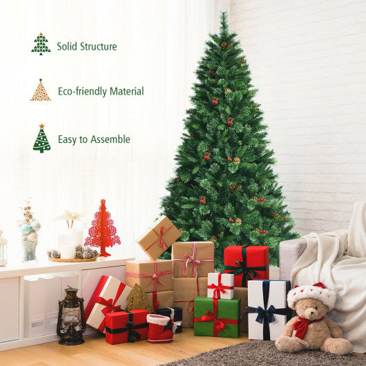This amazing artificial Christmas tree will be an excellent addition to your holiday decorations. The soft lighting creates a relaxed and warm atmosphere for your home office or holiday party helping you relieve stress and enjoy a relaxing holiday. The new PVC and PE material-made branches are safe and environmentally friendly which are odorless non-allergenic and non-flammable. You don't have to worry about installation since the 3-stage design structure hinged branches and foldable metal stand save a lot of time and energy for you to assemble disassemble and store the Christmas tree. With natural and lifelike appearance high-quality and full configuration this pre-decorated Christmas tree will never let you down. Bright red berries and brown pine cones add festive atmosphere Crafted with PVC tip PE tips and pine needles for a dense appearance 500 UL listed LED lights provide warm and joyous charm Hinged branches save time and effort to fluffing and installation Foldable metal stand improves stability and prevents tipping Ideal for celebrating holidays and decorating life
