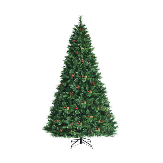 This amazing artificial Christmas tree will be an excellent addition to your holiday decorations. The soft lighting creates a relaxed and warm atmosphere for your home office or holiday party helping you relieve stress and enjoy a relaxing holiday. The new PVC and PE material-made branches are safe and environmentally friendly which are odorless non-allergenic and non-flammable. You don't have to worry about installation since the 3-stage design structure hinged branches and foldable metal stand save a lot of time and energy for you to assemble disassemble and store the Christmas tree. With natural and lifelike appearance high-quality and full configuration this pre-decorated Christmas tree will never let you down. Bright red berries and brown pine cones add festive atmosphere Crafted with PVC tip PE tips and pine needles for a dense appearance 500 UL listed LED lights provide warm and joyous charm Hinged branches save time and effort to fluffing and installation Foldable metal stand improves stability and prevents tipping Ideal for celebrating holidays and decorating life