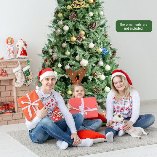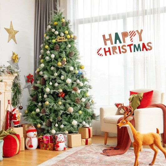 This is the 8 feet unlit Christmas tree designed for indoor festival and holiday decoration. With 1282 PVC branch tips and 369 PE branch tips the tree has a lush and full appearance. Several classic pine cones are decorated on the tree to make it as natural as a real tree. This frosty artificial tree allows you to decorate it according to your preferences. Buy extra ornaments and DIY your dreamed tree to match various party themes or festivals! Meanwhile the relationship between you and your family will be deepened through the interactions. Made of 100% new PVC and PE the tree is odorless non-toxic and recyclable for daily use. Add this tree to warm up your room atmosphere! If you are looking for a Christmas tree like this do not hesitate to place an order! Easy assembly and disassembly with three premium sections Hinged branch tips can be expanded easily in a short time Glitter branches with snowy pine cones giving you a snowy and sparkling look Crafted with 1282 PVC tips and 369 PE tips for a dense appearance New materials are odorless flame-retardant and non-toxic for daily use Ideal for indoor holiday and festival decoration