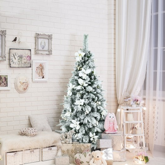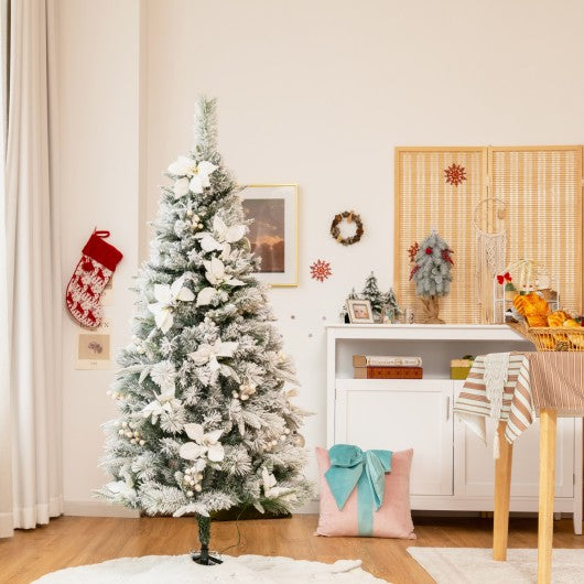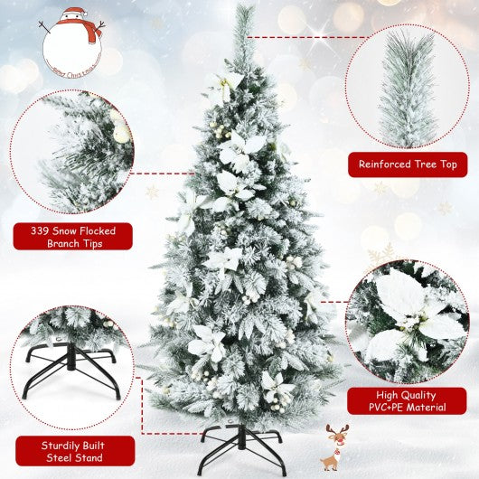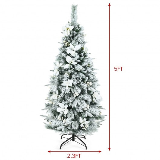 5 Feet Snow Flocked Christmas Pencil Tree with Berries and Poinsettia Flowers
