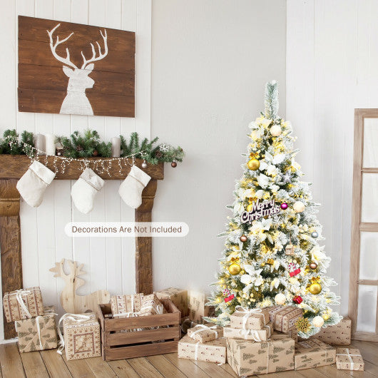This snow-flocked artificial Christmas tree is an eye-catching addition to all occasions for residential and commercial use. Flourishing leaves with pine needles PE and PVC tips showcase natural gradation in realism. Since all leaves are made of 100% new PVC and PE this Christmas tree is odorless and non-toxic for long-term indoor use. And with snow-flocked design the tree brings home excellent wintry scene and festival vibe. Also pre-decorated Christmas flowers and frozen berry clusters enhance visual attractiveness of the tree. Thanks to pre-lit design you can enjoy warm lighting show indoors for better festivity celebration. In addition it is easy to assemble the tree by inserting 2/3/3/3 hinged sections in order. And the tree is stably supported by metal stand showcasing outstanding look. So you can decorate different places to spread sincere wishes and holiday joy. If you are looking for a Christmas tree do not miss it! 3 leaf shapes of pine needles PE and PVC tips for natural gradation Pre-lit design with 180/250/350/450 LED lights for romantic lighting show Hinged branches ensure easy assembly and quick fluffing Pre-decorated Christmas flowers and berry clusters add attractiveness Snow-flocked design showcases wintry atmosphere Folding metal stand for space-saving storage and firm support 100% new material is odorless and safe for long-term use Ideal Christmas decoration for home office school etc Installation guide