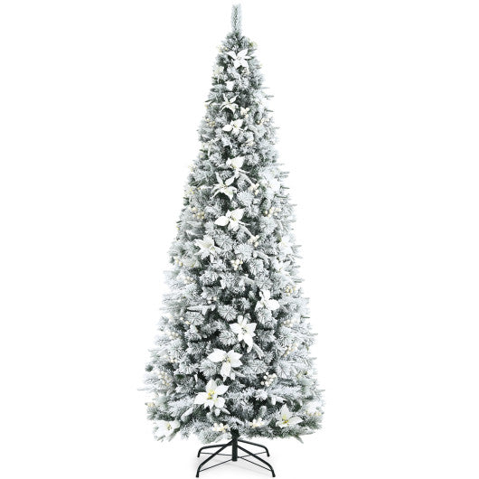 Pre-lit Snow Flocked Christmas Tree with Berries and Poinsettia Flowers-8'