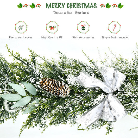 Wishing you all the joys of the Christmas season and have very happy New Year may you enjoy good health in the coming year. This is 6.5 feet un-lit flocked Christmas garland which is trimmed with gloss silver balls snowflakes ribbons leaves and white berries. The lush and lifelike rattan has 280 PE cypress branch tips which looks as real as real plants. You can hang the rattan up by the hook in the end to decorate your home. Add garland on your front door fireplace stand stair railings window frame and dinning table to enjoy a warm and exciting Christmas! And the garland is made of 100% new PE which is odorless non-toxic and durable for long time use. It can definitely stay with you for a long time. If you are looking for a artificial festival celebration wreath with flowers like this do not hesitate to place an order! Un-lit traditional Christmas garland trimmed with rich accessories Interspersed with frosty powder the rattan looks as vivid as real plant 280 individual crafted PE cypress branch tips and 4 leaves make the garland lush 100% new PE material makes the Xmas rattan look real and full Hook design allow you to hang the garland up easily The frosty garland is an attractive ornament to enliven holiday atmosphere Ideal for home office shopping mall and school festival decoration