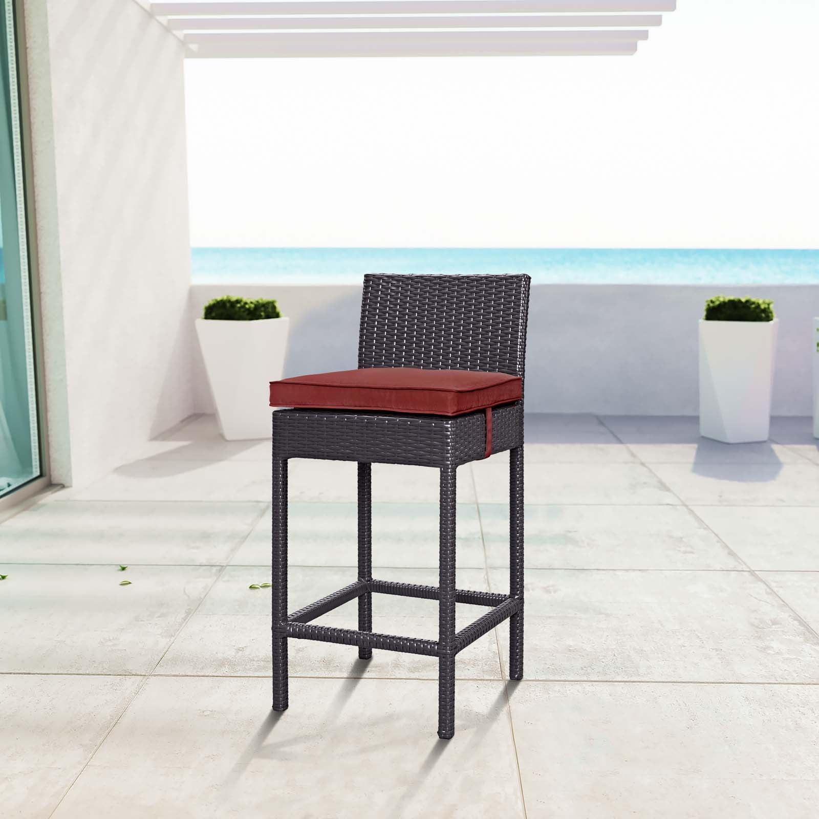 Gather stages of sensitivity with the Convene outdoor bar series. Made with a synthetic rattan weave and a powder-coated aluminum frame, Convene is a versatile outdoor collection that shifts and combines according to the spontaneous needs of the moment. Outfitted with all-weather fabric cushions, leave a positive impression on friends and family while enhancing your patio, backyard or poolside repast in this series of palpable distinction. This installment of the series is an Outdoor Patio Bar Stool. Set Includes: One - Stir Patio Chair Bar Stool