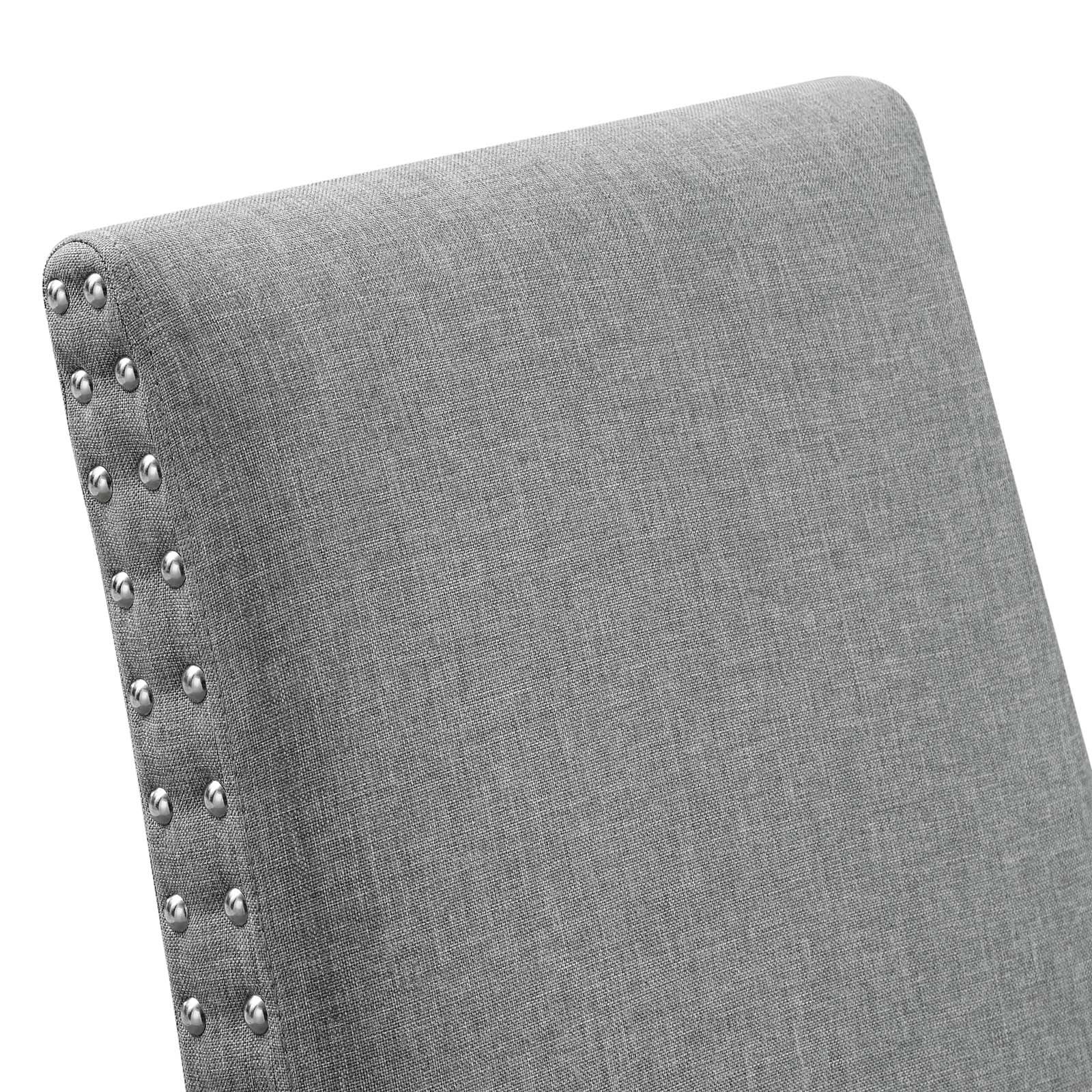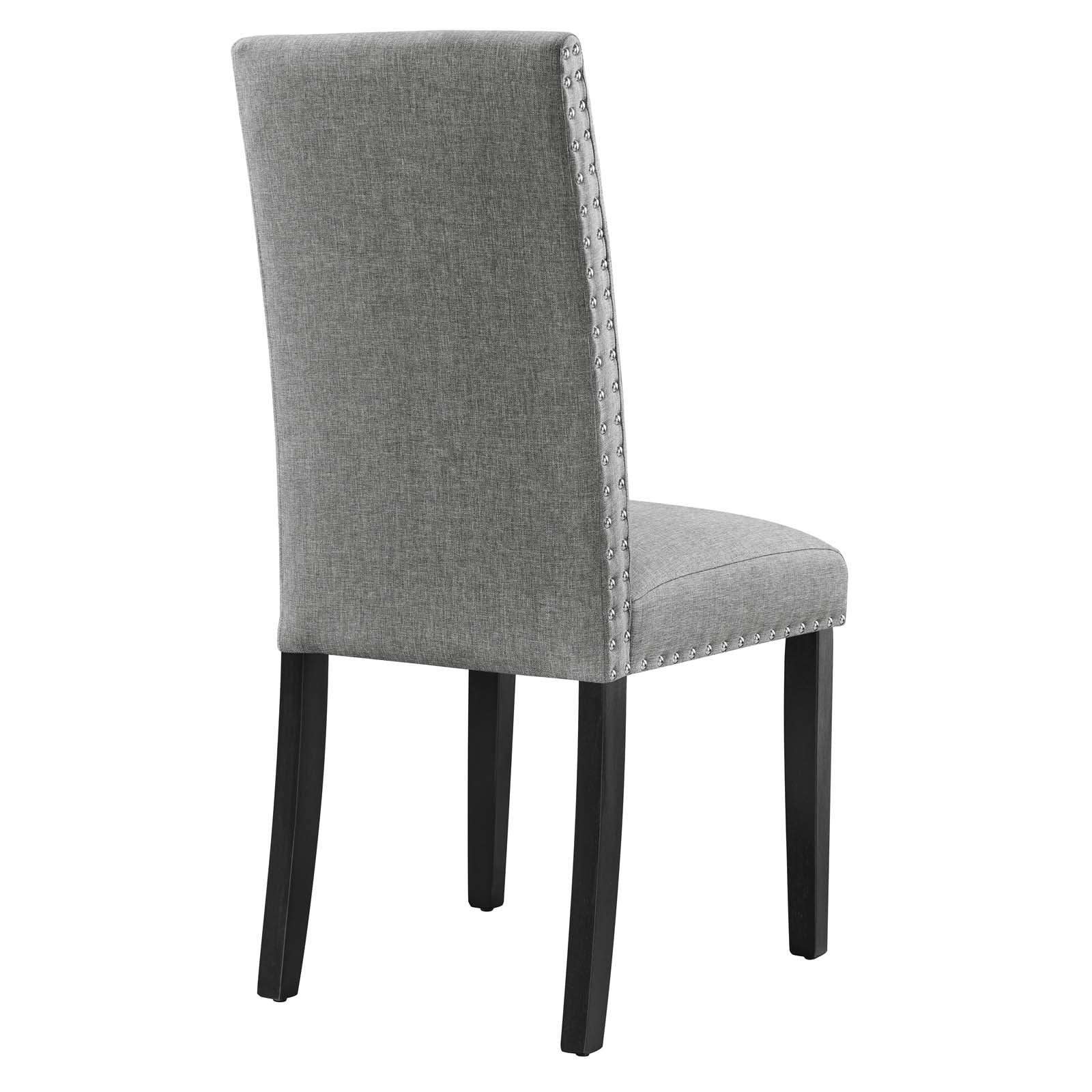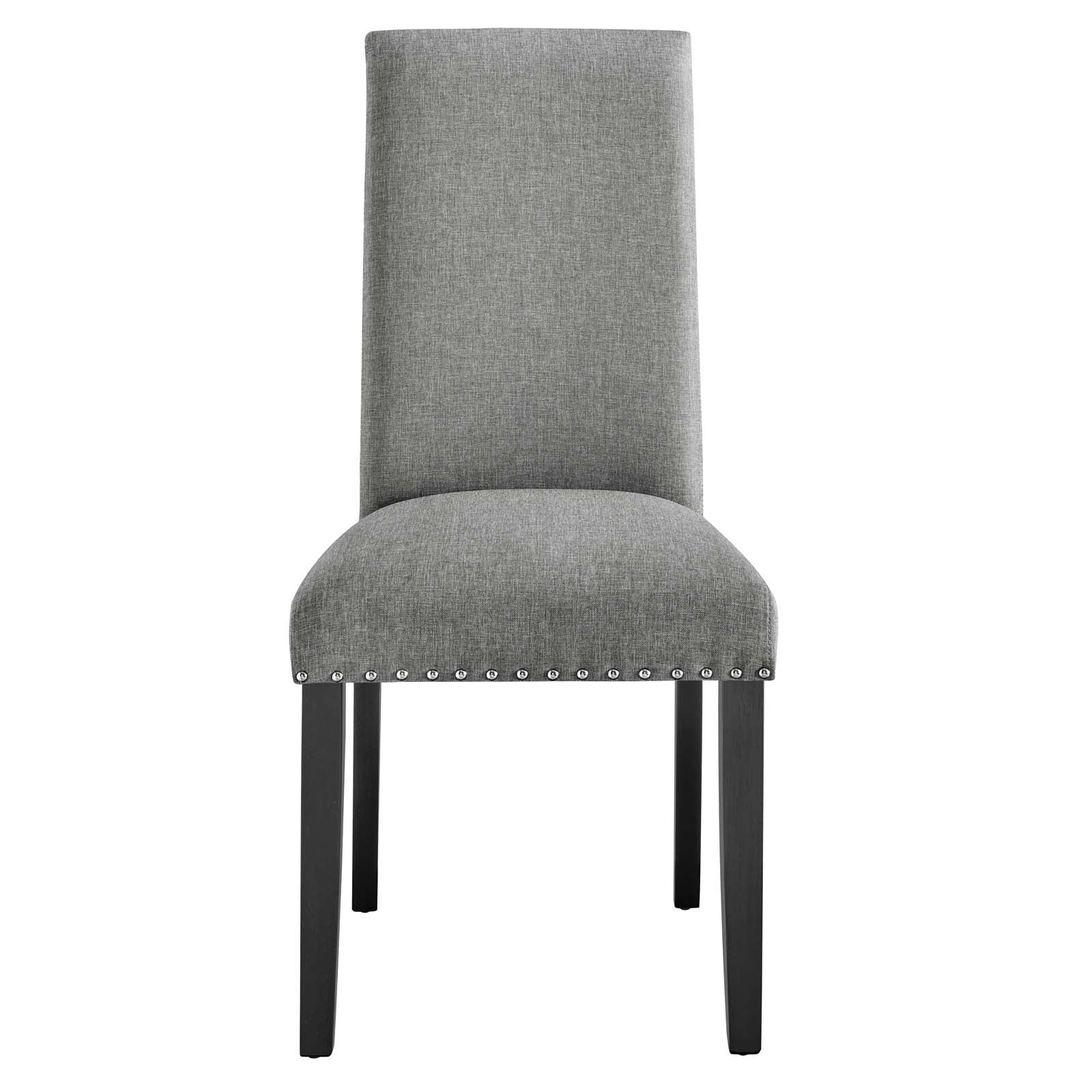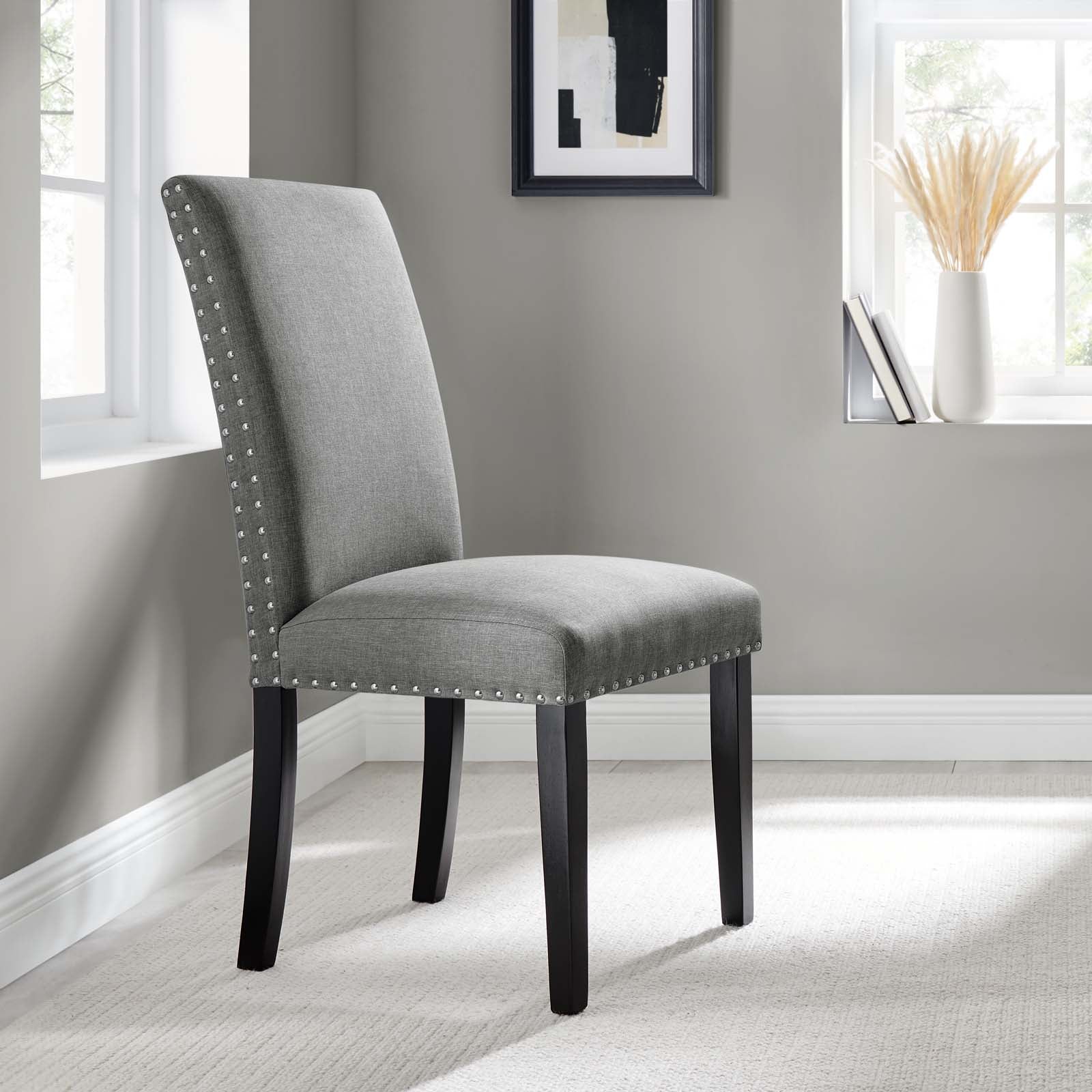 Wrap up moments of quality seating with the Parcel Upholstered Fabric Dining Room Side Chair. Finely upholstered in soft and durable fabric polyester upholstery with elegant nailhead trim, the Parcel Accent Chair delivers a modern offering that enhances the dining room experience. Padded with dense foam and supported by espresso stained tapered wood legs, the Parcel Dining Chair is a stylish addition to your dining room, living room, lounge room, or office. Chair Weight Capacity: 285 lbs. Assembly Required. Set Includes: One - Parcel Dining Side Chair