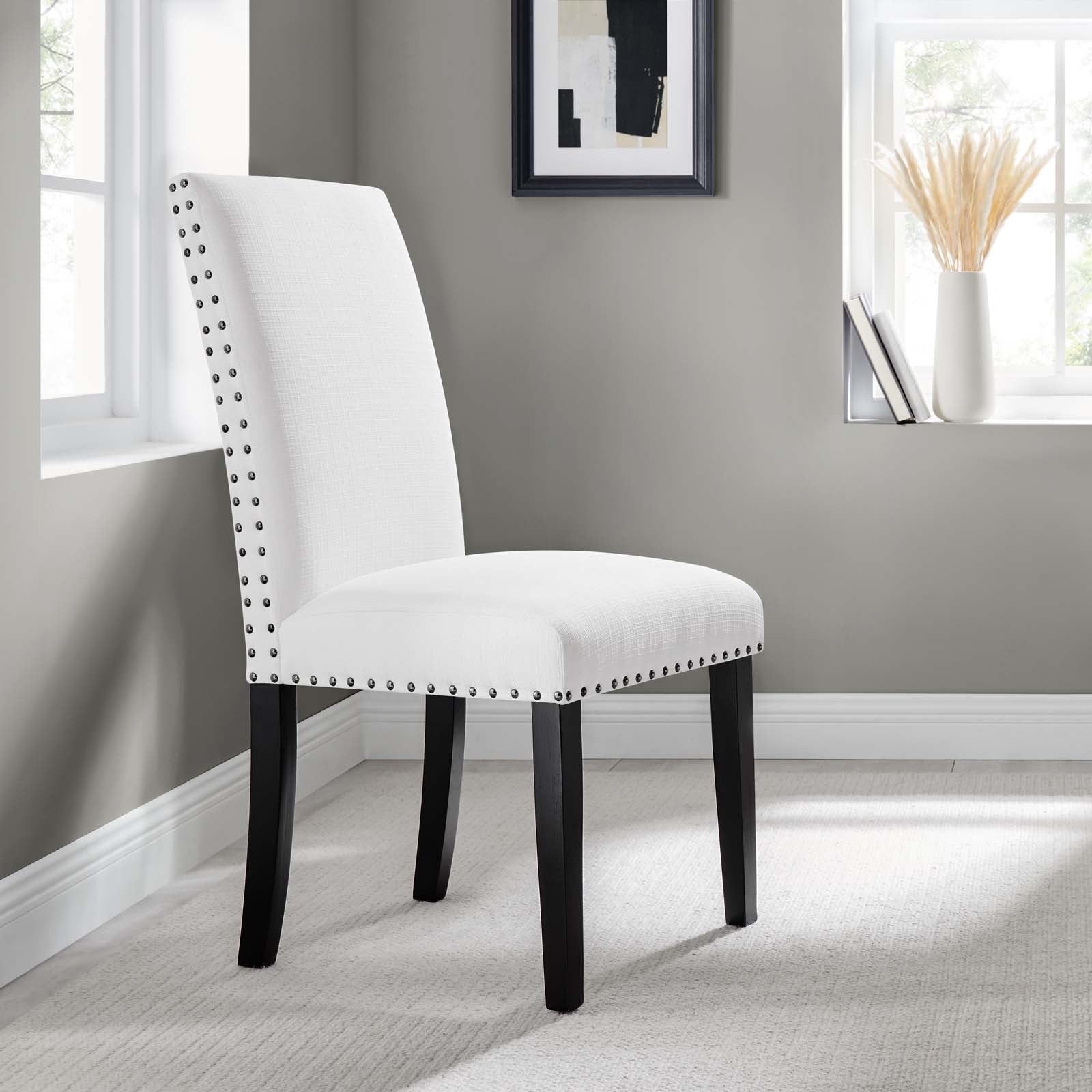 Wrap up moments of quality seating with the Parcel Upholstered Fabric Dining Room Side Chair. Finely upholstered in soft and durable fabric polyester upholstery with elegant nailhead trim, the Parcel Accent Chair delivers a modern offering that enhances the dining room experience. Padded with dense foam and supported by espresso stained tapered wood legs, the Parcel Dining Chair is a stylish addition to your dining room, living room, lounge room, or office. Chair Weight Capacity: 285 lbs. Assembly Required. Set Includes: One - Parcel Dining Side Chair