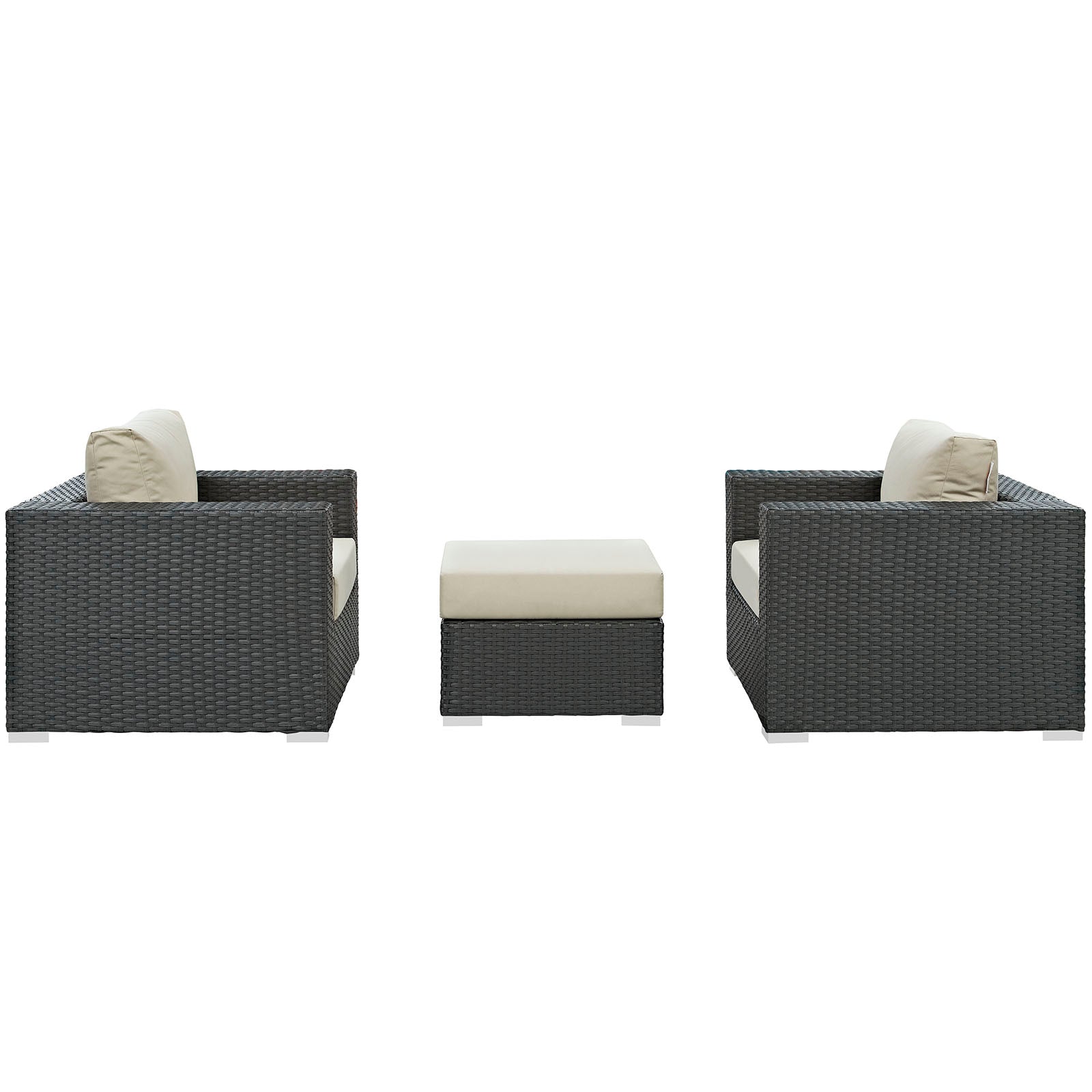 Outfit your patio with an imaginative Sojourn Outdoor Patio Furniture series. The Sojourn Patio Outdoor Collection offers a robust seating experience that easily rearranges according to usage. Outfitted with industry-leading Sunbrella fabric cushions, synthetic rattan weave, UV protection, powder-coated aluminum frame, immensely enjoy your outdoor time with an outdoor conversation set that enhances patio, backyard, or poolside areas. This installment of the series is an Outdoor Patio Furniture Set. Set Includes: One - Sojourn Rattan Outdoor Patio Ottoman Two - Sojourn Rattan Outdoor Patio Armchairs