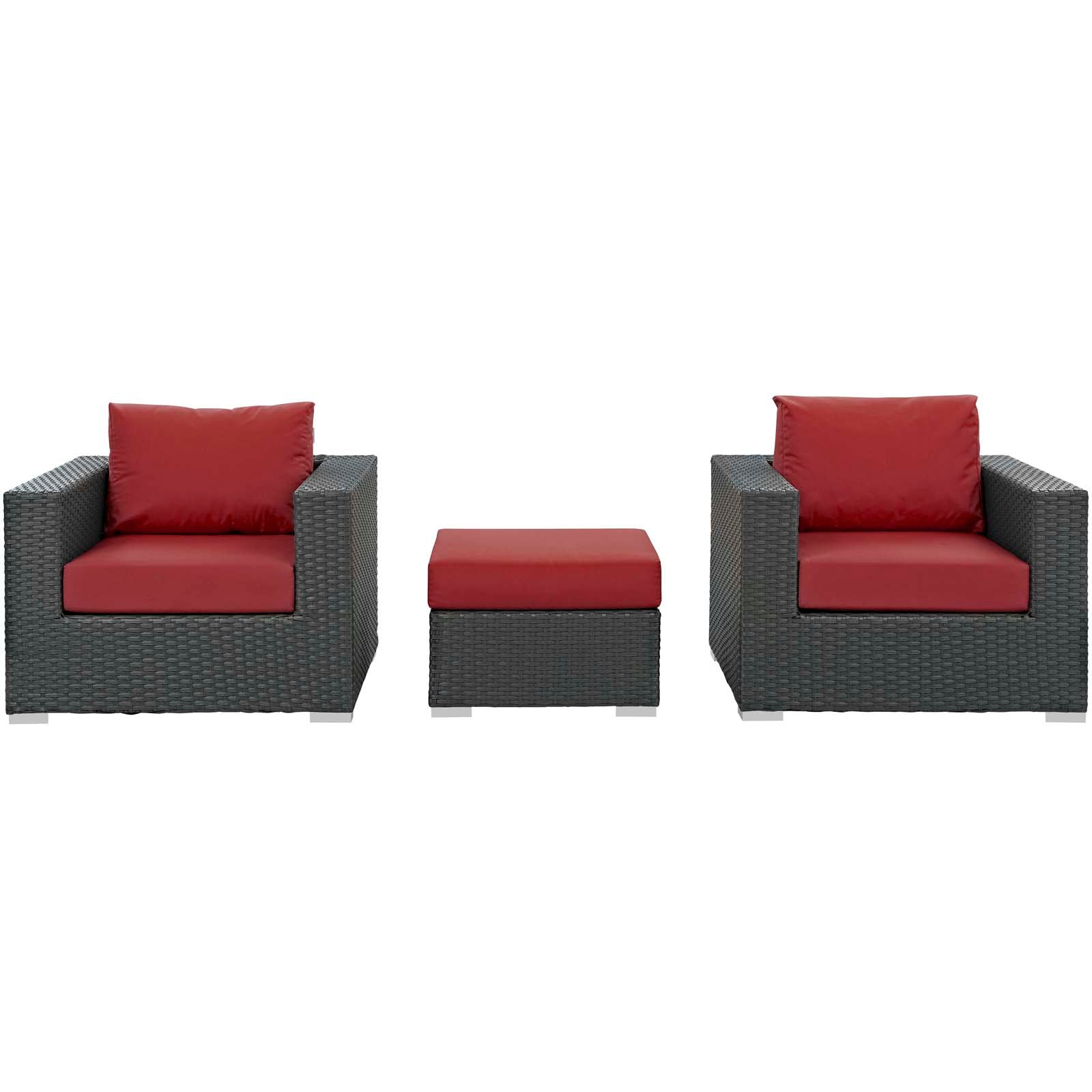 Outfit your patio with an imaginative Sojourn Outdoor Patio Furniture series. The Sojourn Patio Outdoor Collection offers a robust seating experience that easily rearranges according to usage. Outfitted with industry-leading Sunbrella fabric cushions, synthetic rattan weave, UV protection, powder-coated aluminum frame, immensely enjoy your outdoor time with an outdoor conversation set that enhances patio, backyard, or poolside areas. This installment of the series is an Outdoor Patio Furniture Set. Set Includes: One - Sojourn Rattan Outdoor Patio Ottoman Two - Sojourn Rattan Outdoor Patio Armchairs