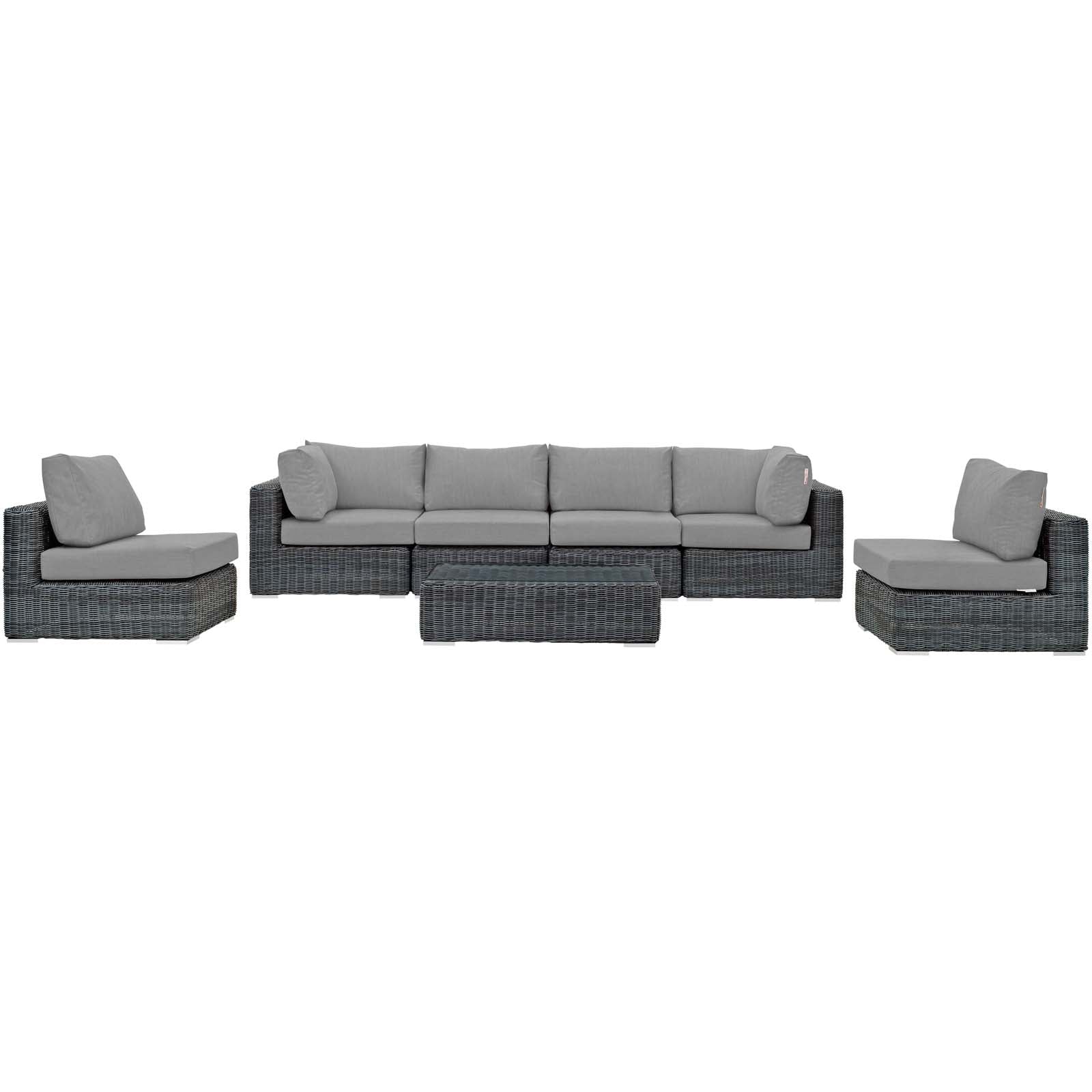 Experience the outdoors with exceptional comfort and quality. Summon Outdoor Patio Sectional Sofa set offers an exquisite two-tone synthetic rattan weave, plush all-weather cushions with industry-leading Sunbrella fabric, UV protection, and a sturdy powder-coated aluminum frame. Featuring an elegant modern look, Summon Patio Sectional Sofa Set is part of an avant-garde outdoor sectional series well-equipped for enhancing patio, backyard, or poolside gatherings. This installment of the series is an Outdoor Patio Furniture set with Coffee Table. Set Includes: Four - Summon Rattan Outdoor Patio Armless Chairs One - Summon Rattan Outdoor Patio Coffee Table Two - Summon Rattan Outdoor Patio Corners