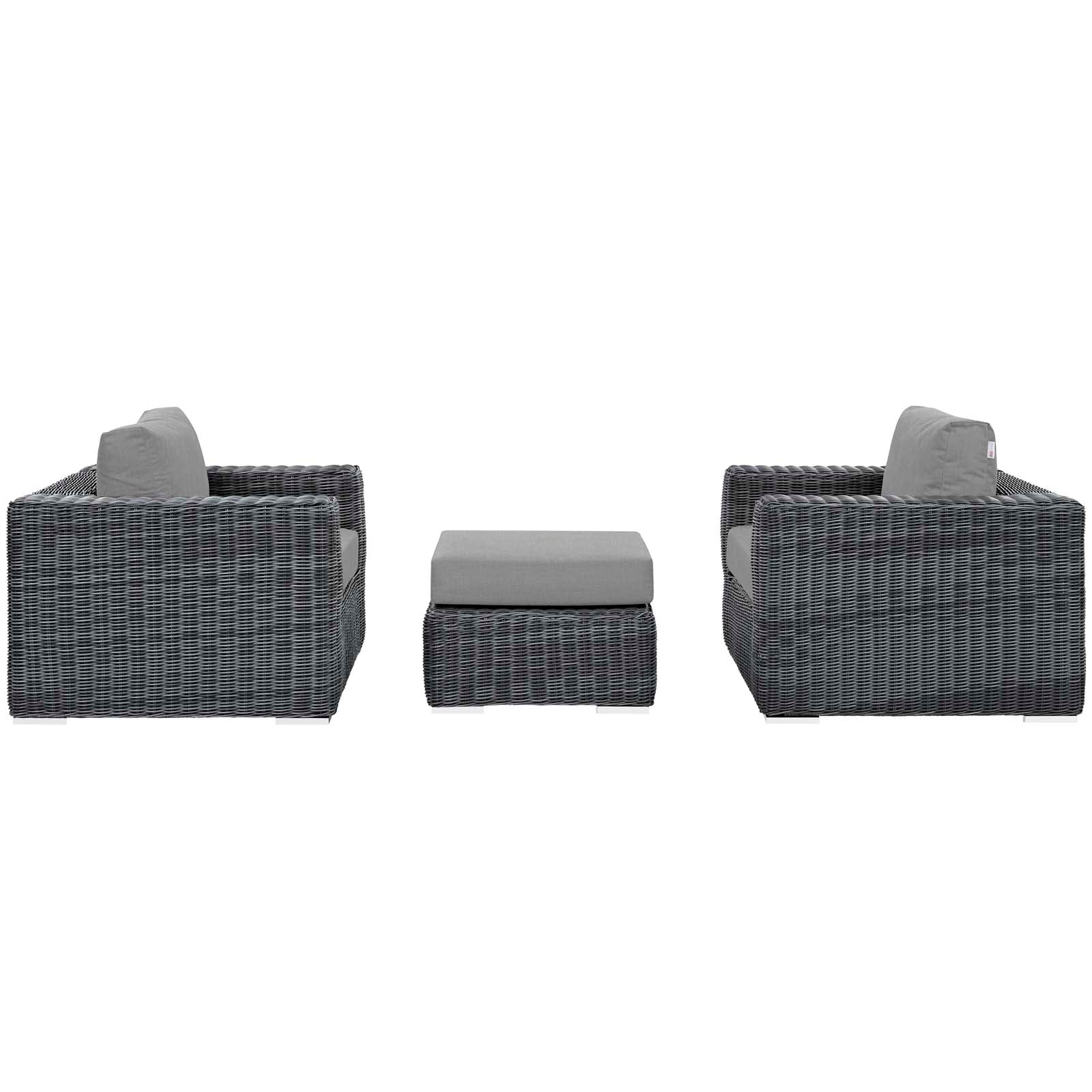 Experience the outdoors with exceptional comfort and quality. Summon Outdoor Patio Sectional Sofa set offers an exquisite two-tone synthetic rattan weave, plush all-weather cushions with industry-leading Sunbrella fabric, UV protection, and a sturdy powder-coated aluminum frame. Featuring an elegant modern look, Summon Patio Sectional Sofa Set is part of an avant-garde outdoor sectional series well-equipped for enhancing patio, backyard, or poolside gatherings. This installment of the series is an Outdoor Patio Furniture set. Set Includes: One - Summon Rattan Outdoor Patio Ottoman Two - Summon Rattan Outdoor Patio Armchairs