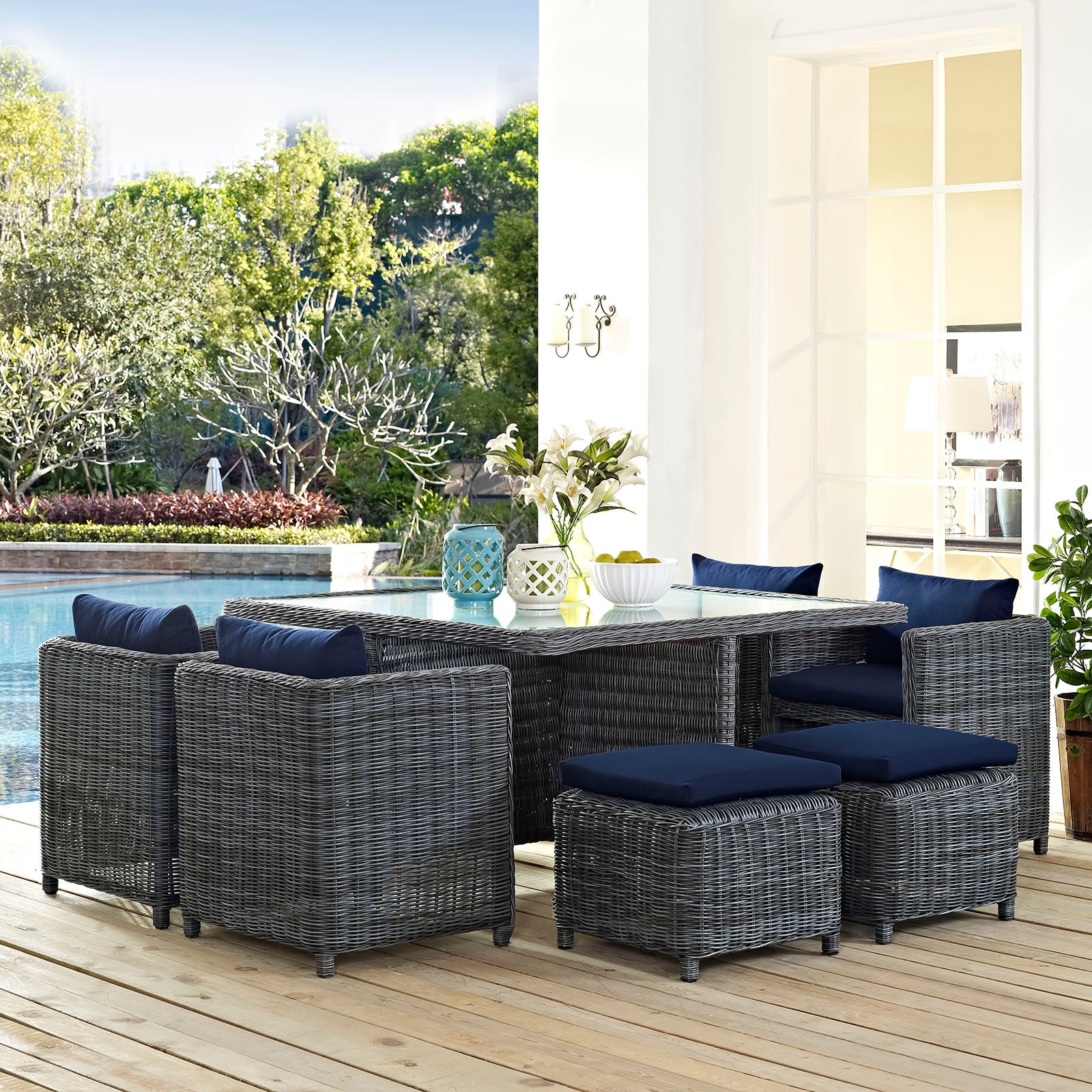 Experience the outdoors with exceptional comfort and quality. Summon Outdoor Patio Furniture Dining Set offers an exquisite two-tone synthetic rattan weave, plush all-weather cushions with industry-leading Sunbrella fabric, UV protection, and a sturdy powder-coated aluminum frame. Featuring rounded arms and an elegant modern look, Summon Patio Dining set is part of an avant-garde outdoor sectional series well-equipped for enhancing patio, backyard, or poolside gatherings. This installment of the series is an Outdoor Patio Dining Set. Set Includes: Four - Summon Outdoor Wicker Patio Stools Four - Summon Outdoor Wicker Patio Chairs One - Summon Outdoor Wicker Patio Table