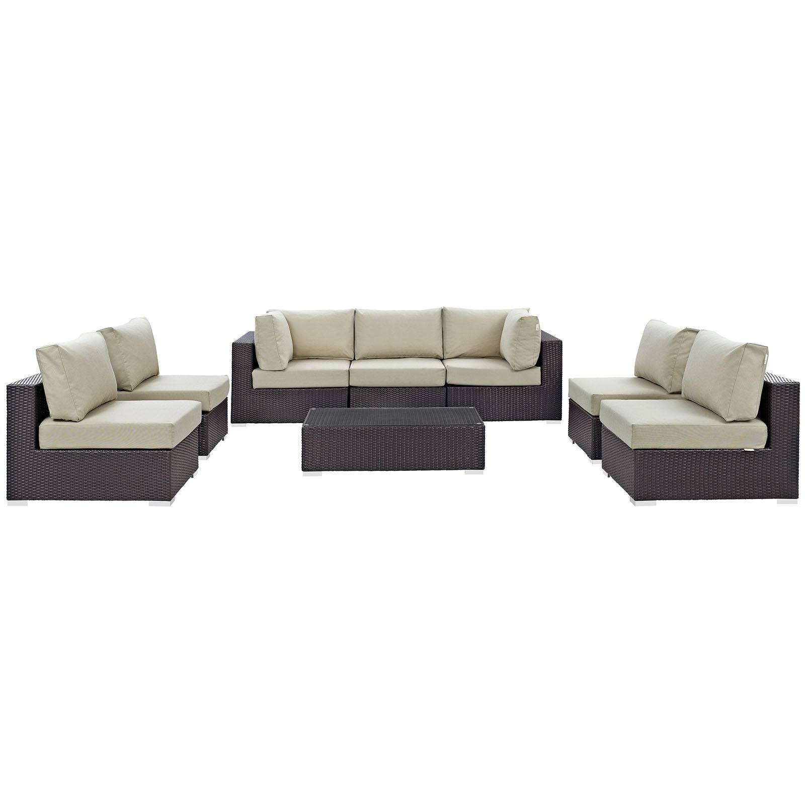 Gather stages of sensitivity with the Convene Outdoor Sectional series. Made with a synthetic rattan weave and a powder-coated aluminum frame, Convene is a versatile outdoor furniture set that shifts and combines according to the spontaneous needs of the moment. Outfitted with all-weather fabric cushions, leave a positive impression on friends and family while enhancing your patio, backyard, or poolside repast in this series of palpable distinction. This installment of the series is an Outdoor Patio Sectional Sofa Set. Set Includes: Five - Convene Outdoor Patio Armless Section One - Convene Outdoor Patio Coffee Table Two - Convene Outdoor Patio Corner Section