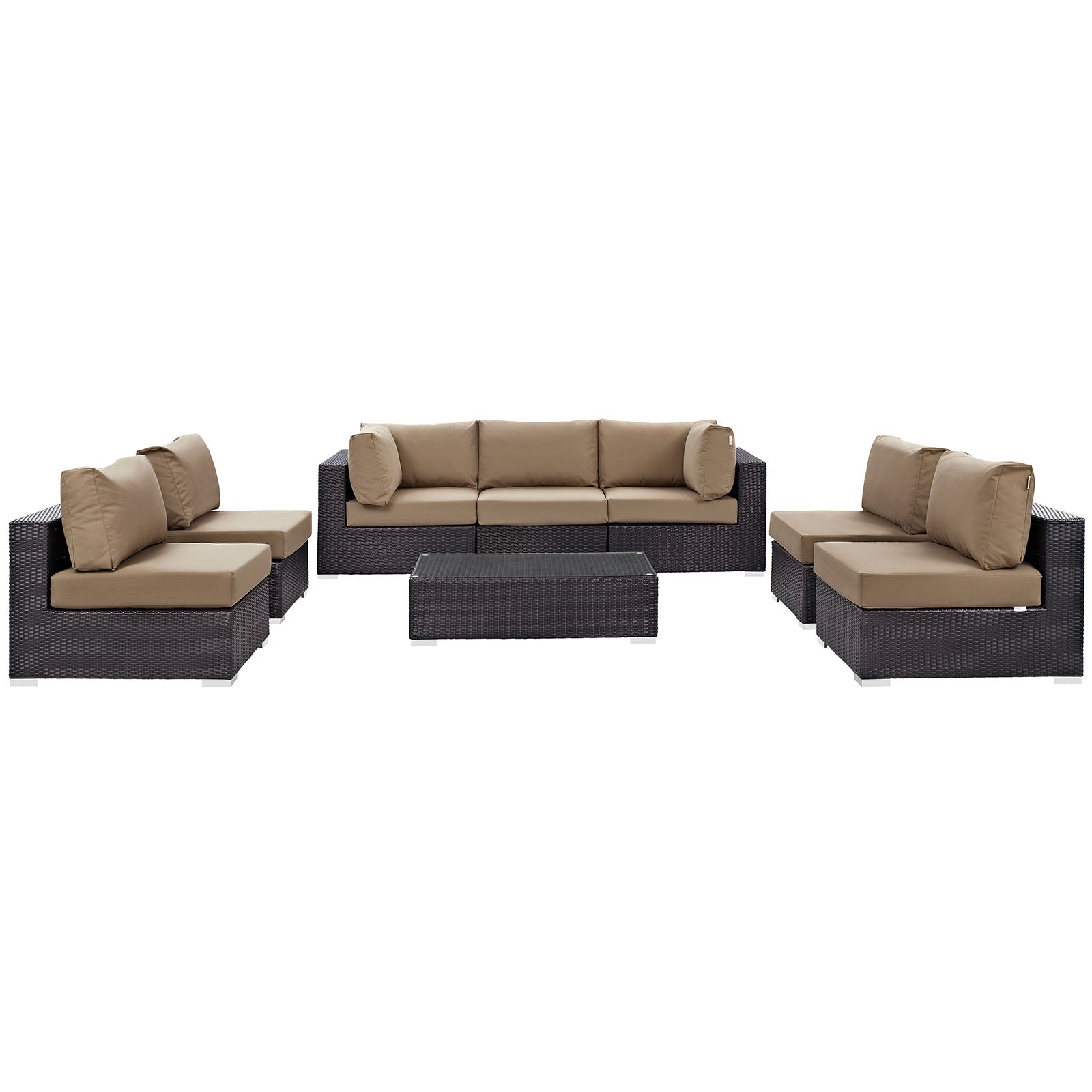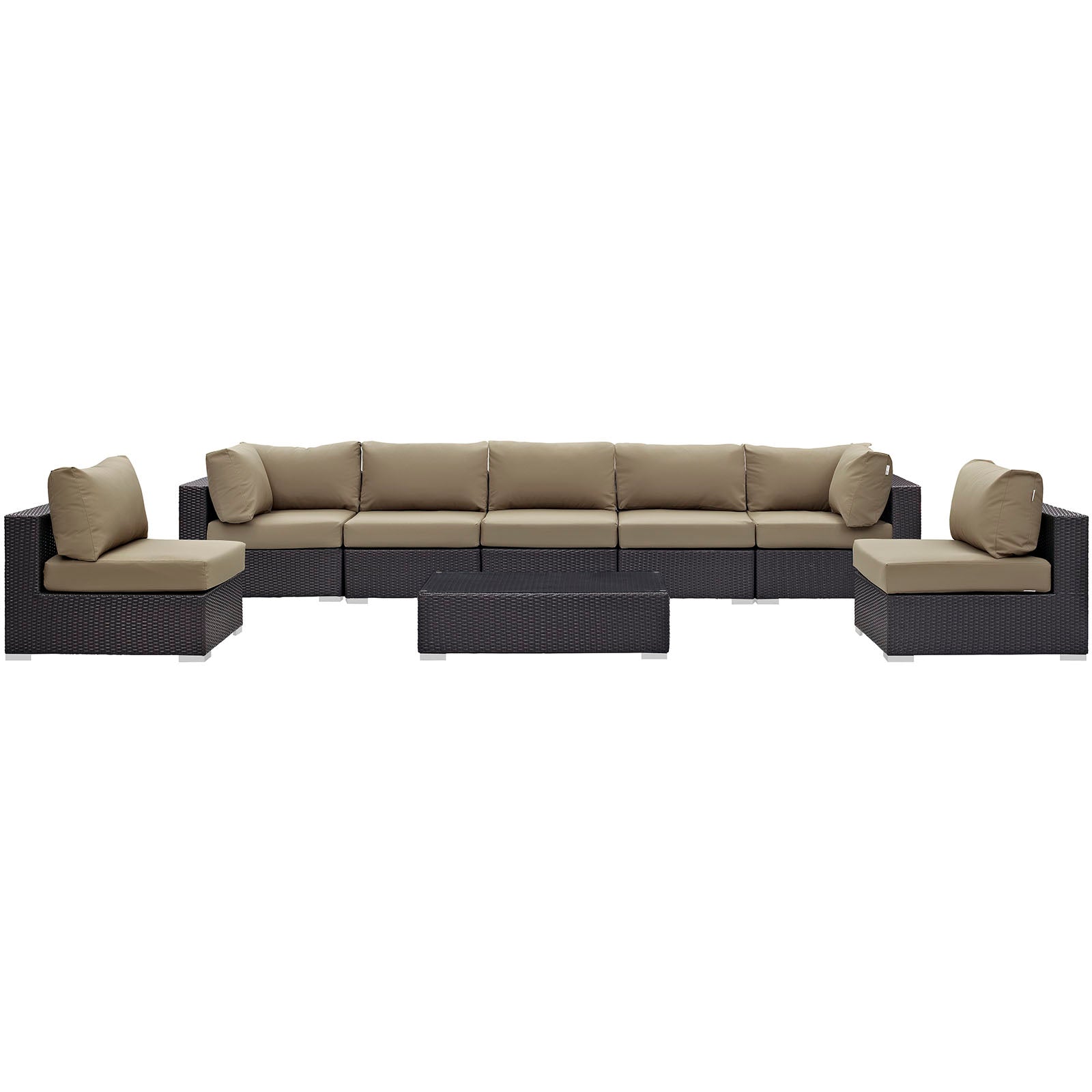 Gather stages of sensitivity with the Convene Outdoor Sectional series. Made with a synthetic rattan weave and a powder-coated aluminum frame, Convene is a versatile outdoor furniture set that shifts and combines according to the spontaneous needs of the moment. Outfitted with all-weather fabric cushions, leave a positive impression on friends and family while enhancing your patio, backyard, or poolside repast in this series of palpable distinction. This installment of the series is an Outdoor Patio Sectional Sofa Set. Set Includes: Five - Convene Outdoor Patio Armless Section One - Convene Outdoor Patio Coffee Table Two - Convene Outdoor Patio Corner Section