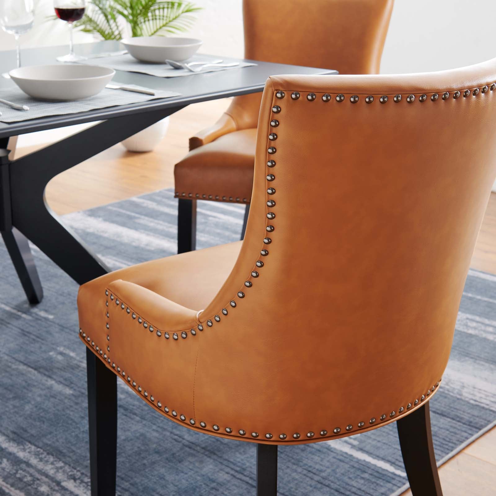 Inspire your dŽcor with the Marquis Dining Side Chair. Marquis is fashioned with a chic hourglass shaped back, studded nailhead trim, non-marking foot caps, tapered wood legs, and a regal seat generously padded in foam and upholstered in durable vegan leather. Marquis works well in both modern and traditional dining rooms as well as in the living room, entryway, or home office. Set Includes: One - Marquis Dining Chair