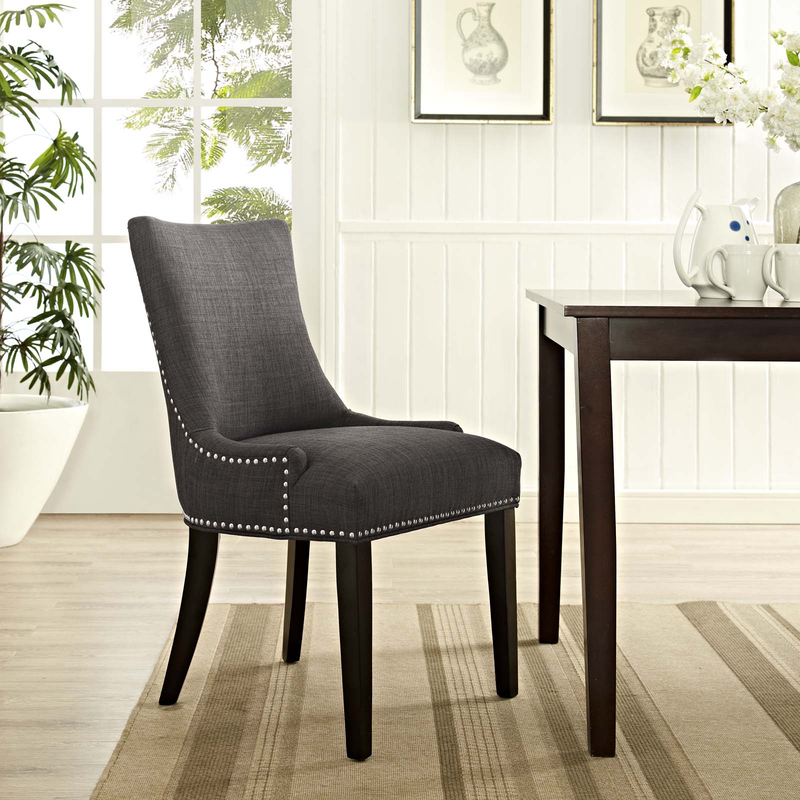 Inspire your decor with the Marquis Dining Side Chair. Marquis is fashioned with a chic hourglass shaped back, studded nailhead trim, non-marking foot caps, tapered wood legs, and a regal seat generously padded in foam and upholstered in polyester fabric. Marquis works well in both modern and traditional dining rooms. Set Includes: One - Marquis Dining Chair.