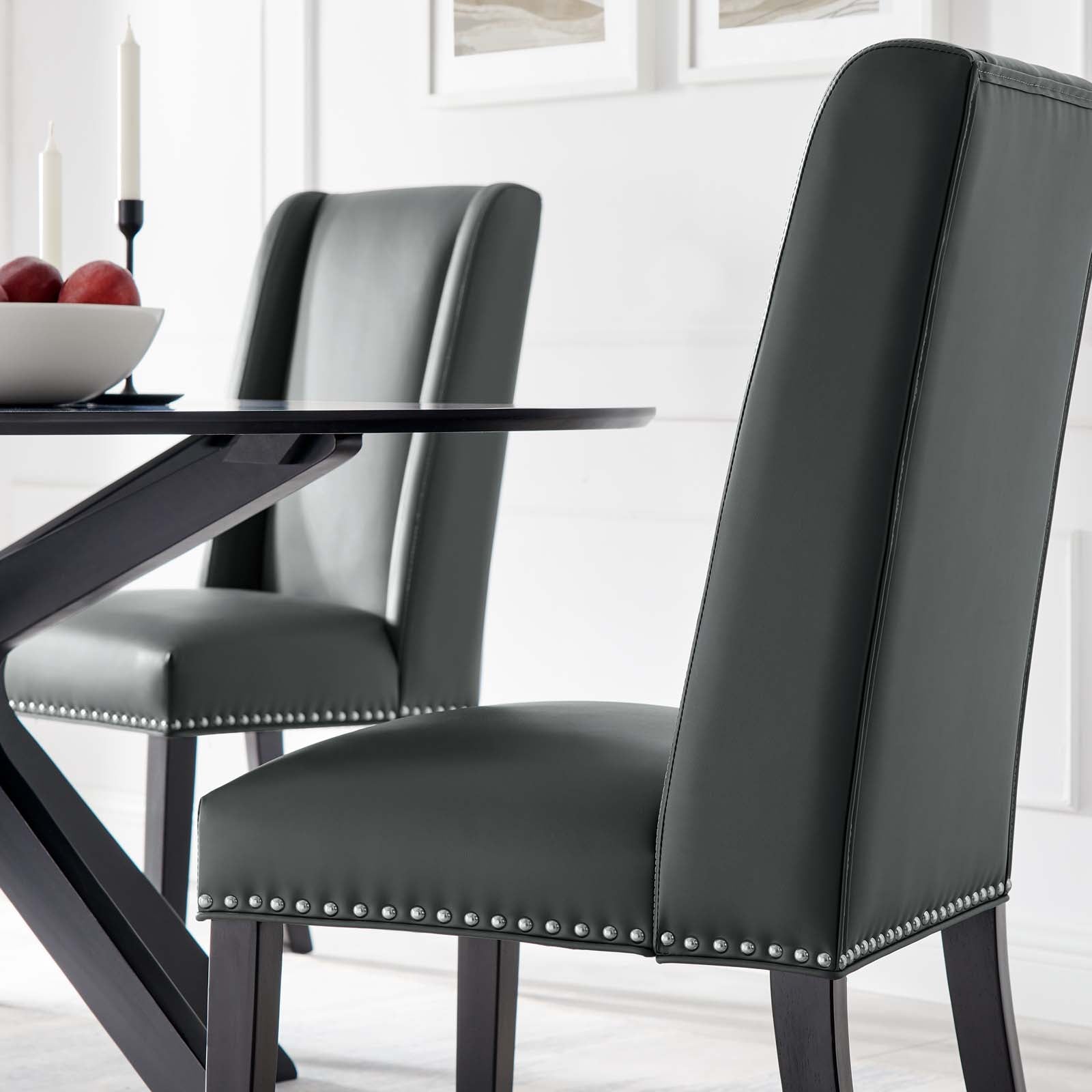 Explore the vast riches of a treasured heritage with the Baron Dining Chair. Designed to resonate elegance, this dining side chair features a charming back and polished nailhead trimmed seat with a dash of grace and noble appeal. Complete with dense foam padding, fine vegan leather upholstery, solid wood and MDF frame, and legs with non-marking foot glides, this updated Parsons chair is a stylish dining chair perfect for the dining room, living room, entryway, or home office. Weight Capacity: 500 lbs. Set Includes: One - Baron Dining Chair