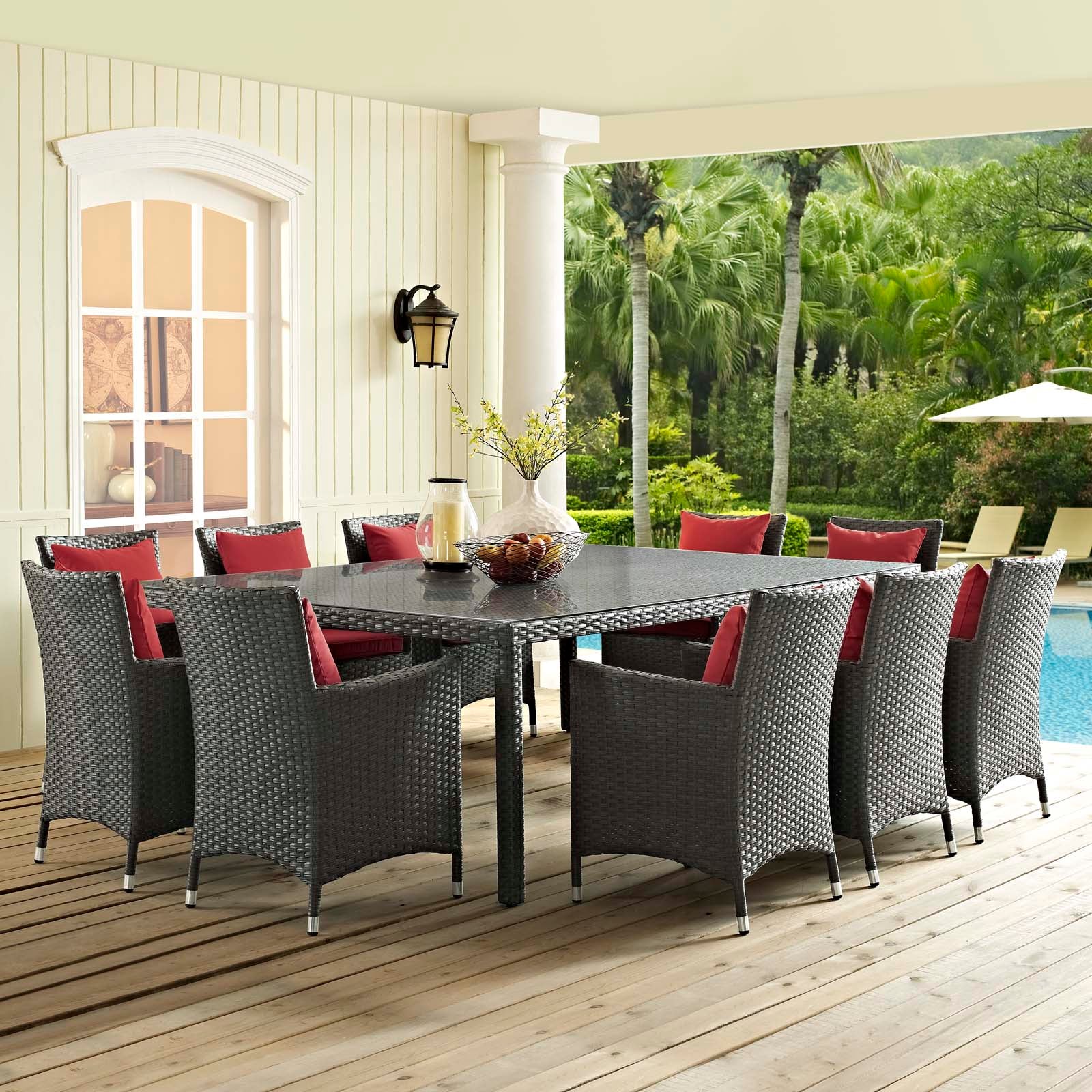 Outfit your patio with an imaginative Sojourn Outdoor Patio Furniture series. The Sojourn Patio Dining Collection offers a robust seating experience that easily rearranges according to usage. Outfitted with industry-leading Sunbrella fabric cushions, synthetic rattan weave, UV protection, powder-coated aluminum frame, immensely enjoy your outdoor time with an outdoor dining series that enhances patio, backyard, or poolside areas. This installment of the series is an Outdoor Patio Dining Set. Set Includes: One - Sojourn 90" Dining Table Ten - Sojourn Dining Armchair