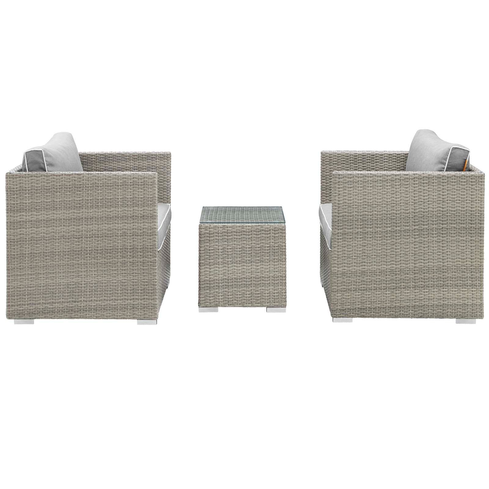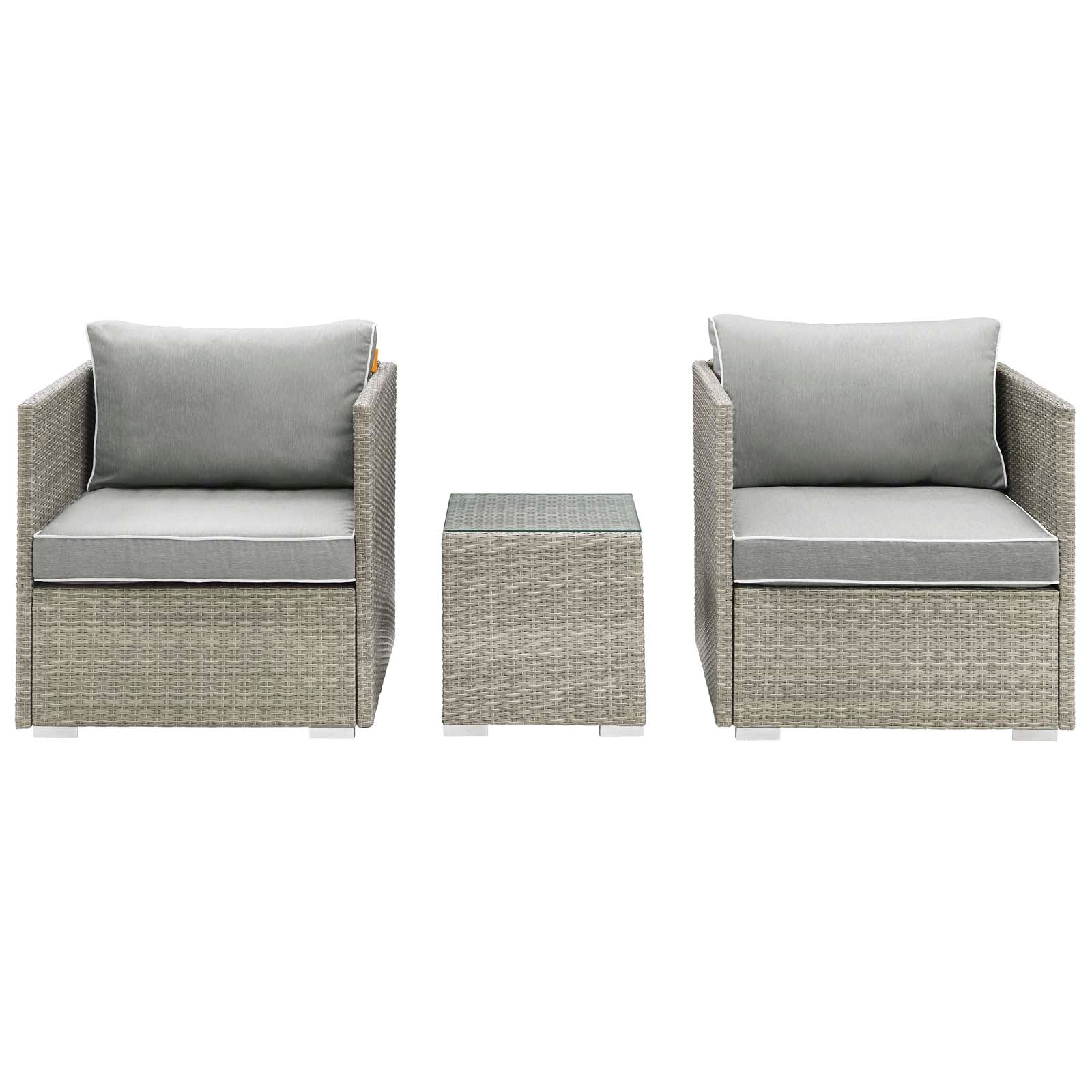 Enjoy the outdoors while benefiting from style and comfort. Repose offers a detailed tan and gray synthetic rattan weave with UV protection for eye-catching appeal and durability, plush 4� thick all-weather polyester cushions with contrasting color French piping, non-marking foot pads, and sturdy powder-coated aluminum framed seats and ottomans that support up to 331 pounds each. Subtle style defines the Repose outdoor sectional collection making it a natural choice for enhancing your patio, backyard, or poolside gatherings. Set Includes: One - Repose Outdoor Patio Side Table Two - Repose Armchair