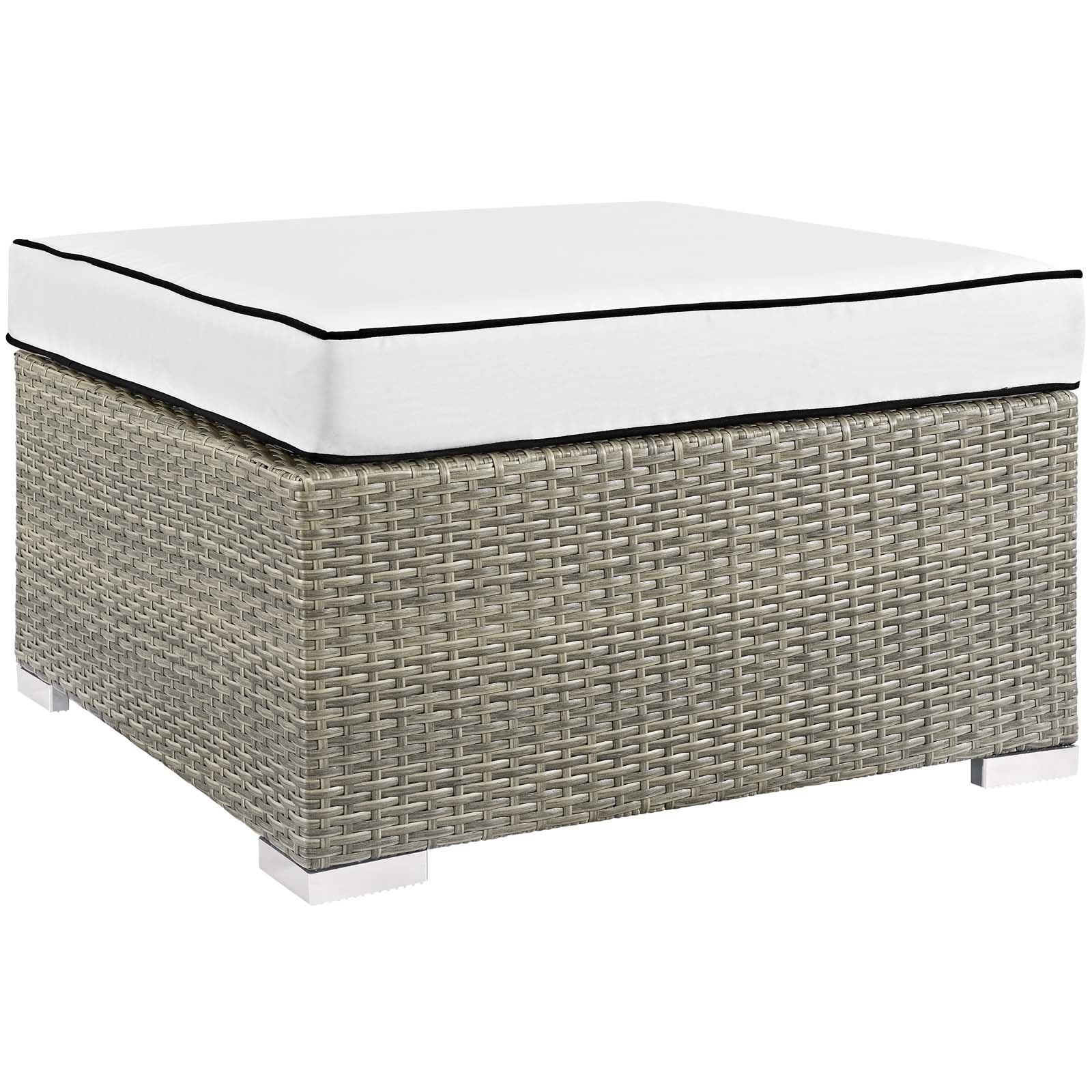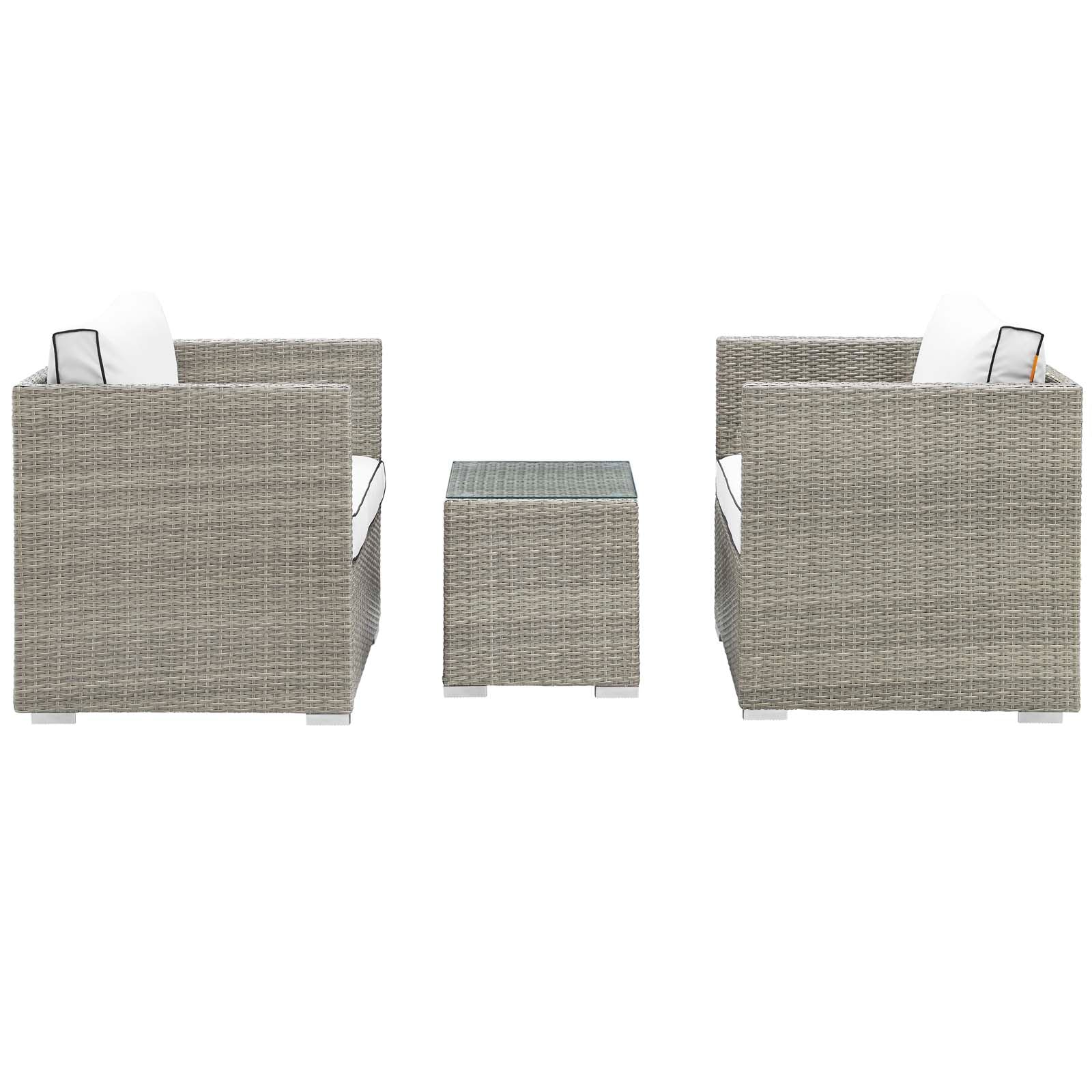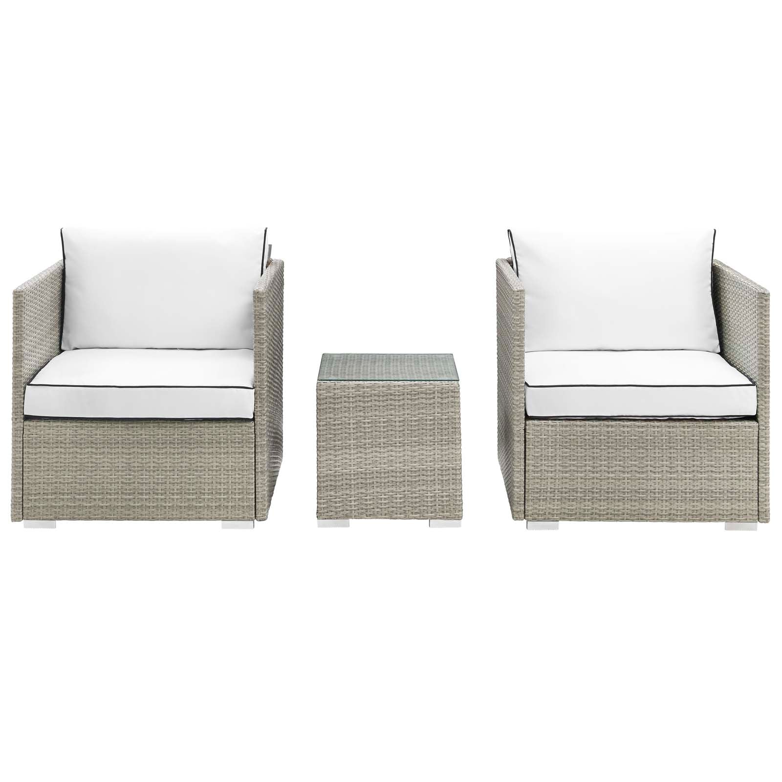 Enjoy the outdoors while benefiting from style and comfort. Repose offers a detailed tan and gray synthetic rattan weave with UV protection for eye-catching appeal and durability, plush 4� thick all-weather polyester cushions with contrasting color French piping, non-marking foot pads, and sturdy powder-coated aluminum framed seats and ottomans that support up to 331 pounds each. Subtle style defines the Repose outdoor sectional collection making it a natural choice for enhancing your patio, backyard, or poolside gatherings. Set Includes: One - Repose Outdoor Patio Side Table Two - Repose Armchair