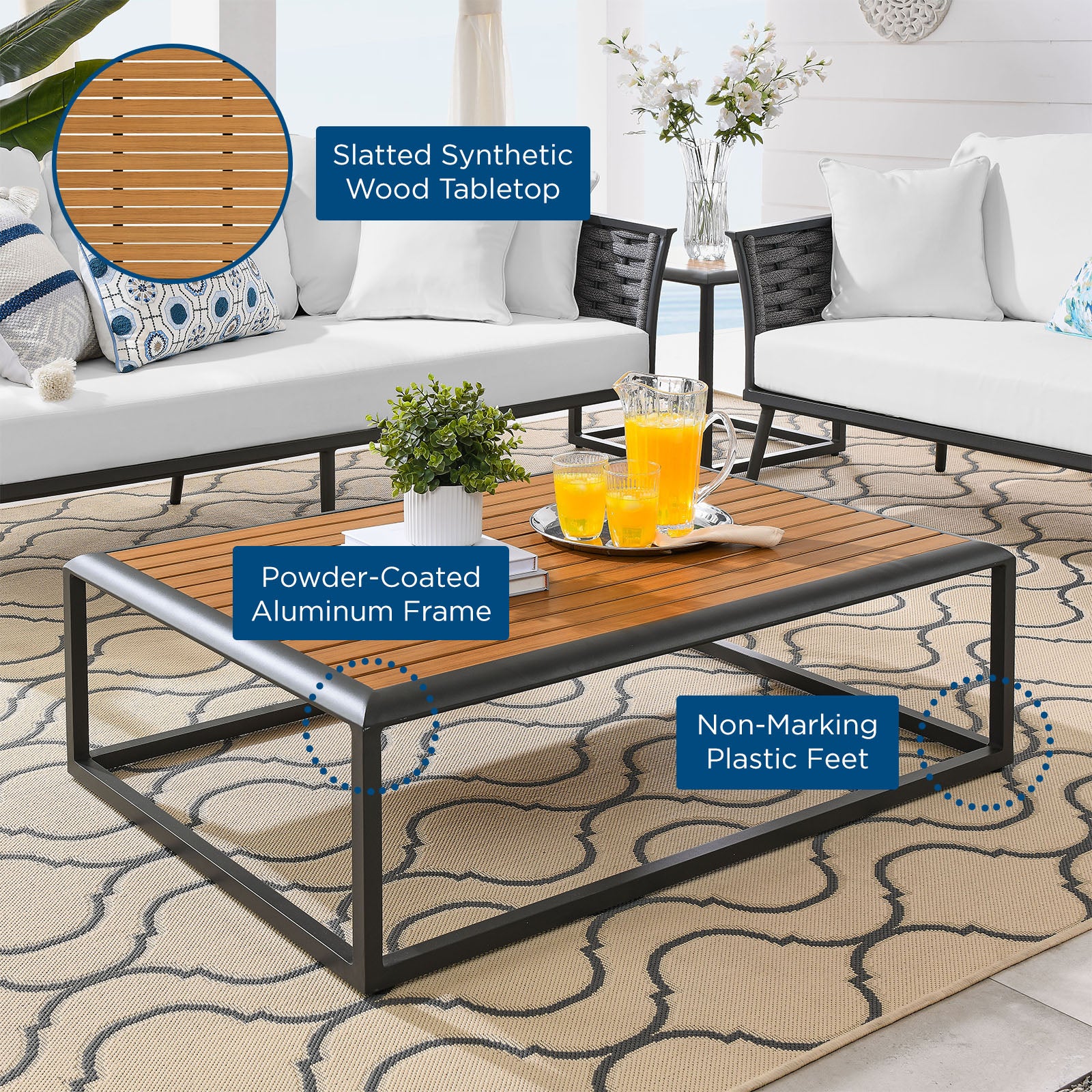 Gather family and friends for pleasant weather and good conversation with the Stance Outdoor Collection. Boasting a contemporary modern look, Stance features a sleek powder-coated aluminum frame offering a charming complement to the slatted synthetic wood tabletop—the perfect location to rest a plate of hors d'oeuvres, a cocktail, or cup of coffee. A versatile set designed for long-lasting durability, each piece in the Stance Collection can be mixed and matched and effortlessly arranged to fit the spontaneous needs of you and your guests. Comes Fully Assembled. Set Includes: One - Stance Coffee Table