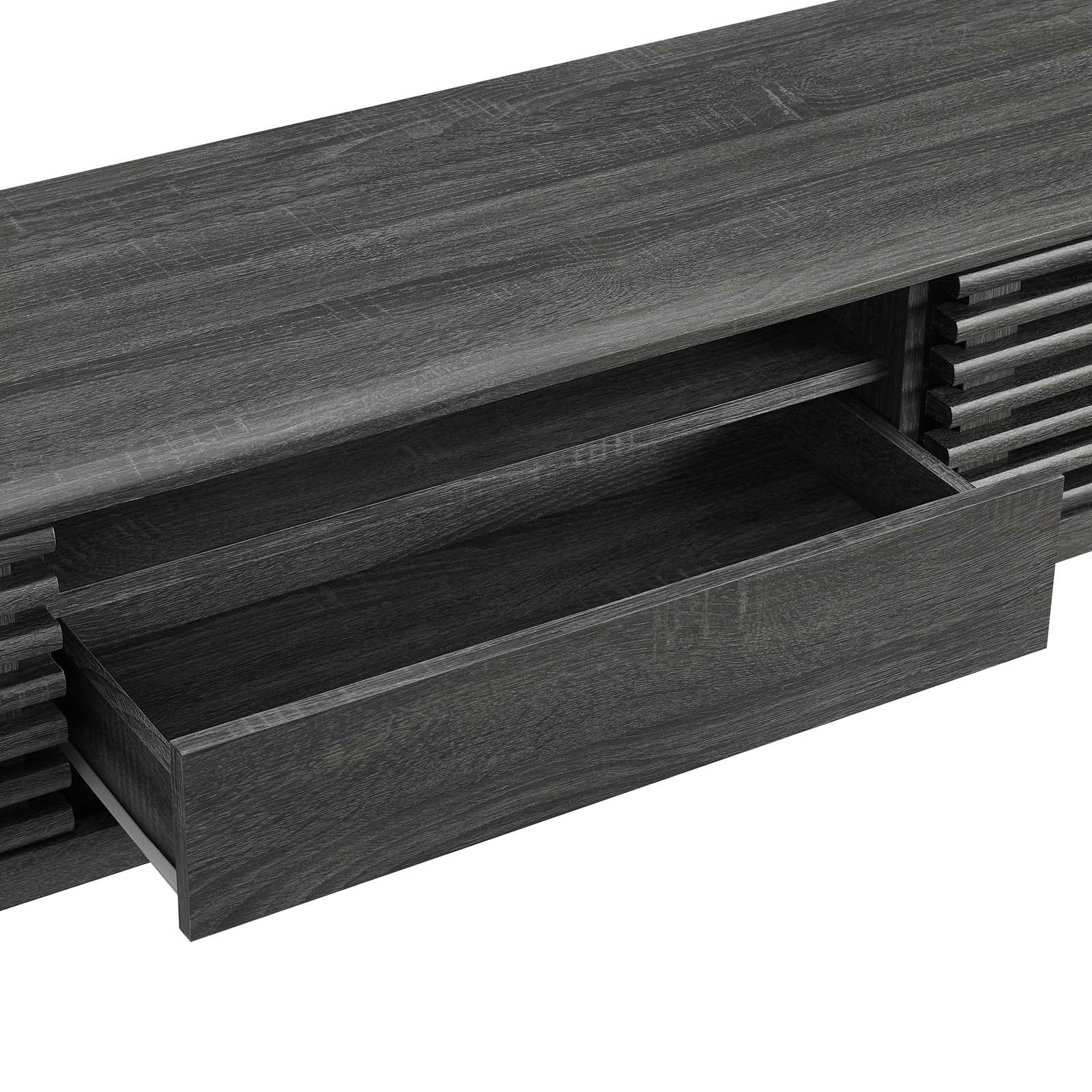 Tap into mid-century aesthetics with the Render 70” TV Stand. Render features a durable particleboard frame with smooth walnut grain veneer, four tapered wood legs, full-extension center drawer with shelf on top, non-marking foam foot pads, and opposite side adjustable shelves with dual slatted sliding doors for sophisticated media storage. Complete with a cable management hole, Render’s contemporary linear style is the perfect addition to the modern living room, bedroom, home office, lounge, or recreation area. Set Includes: One - Render 70" TV Stand