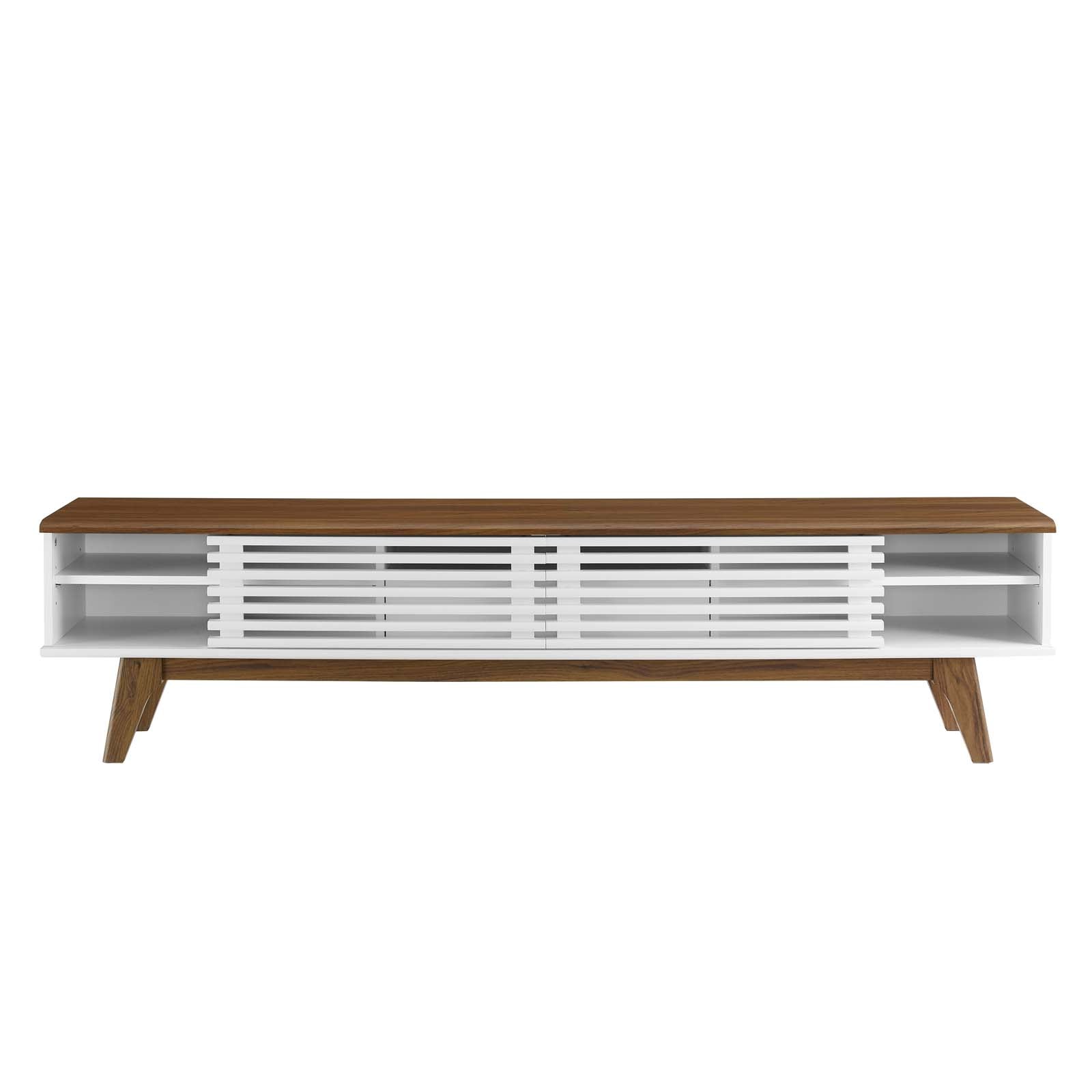 Tap into mid-century aesthetics with the Render 70” TV Stand. Render features a durable particleboard frame with smooth walnut grain veneer, four tapered wood legs, full-extension center drawer with shelf on top, non-marking foam foot pads, and opposite side adjustable shelves with dual slatted sliding doors for sophisticated media storage. Complete with a cable management hole, Render’s contemporary linear style is the perfect addition to the modern living room, bedroom, home office, lounge, or recreation area. Set Includes: One - Render 70" TV Stand