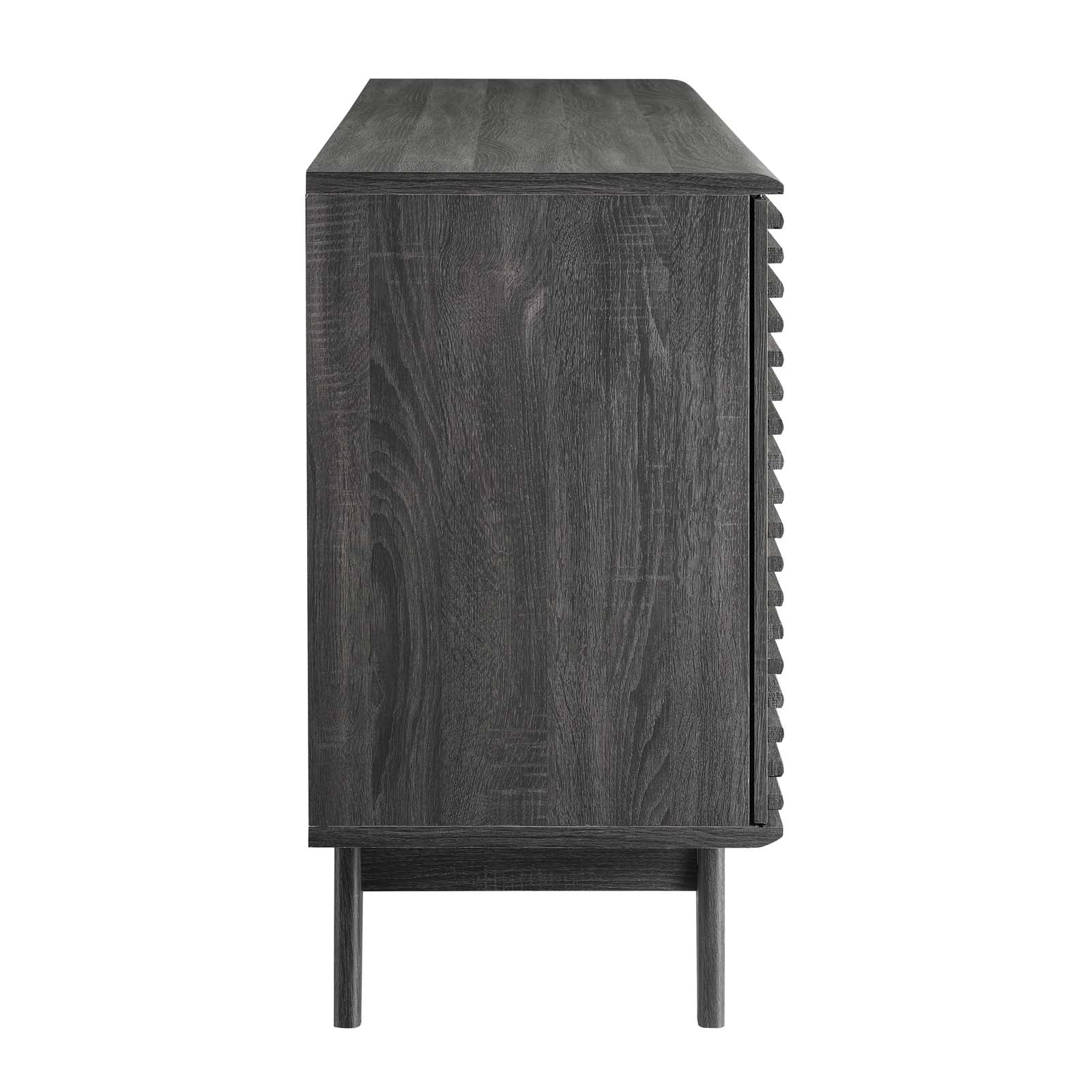 Tap into mid-century aesthetics with the Render Sideboard Buffet Display Stand. This dining room buffet table features a durable particleboard frame with smooth walnut grain laminate, four tapered wood legs, an adjustable shelf on both sides, three center full-extension glide drawers, and two sliding doors for easy access to shelf storage. Render features an abundance of storage for your silverware, dishes, and other dining room finery. Boasting a mid-century modern style this accent serving table features a solid construction with a pleasing look and practical functionality. Perfect as a sideboard, credenza, buffet table, or display stand, Render also accommodates flat-screen TVs up to 70” wide as a living room or lounge area TV stand. Set Includes: One - Render 63" Sideboard Buffet Table or TV Stand