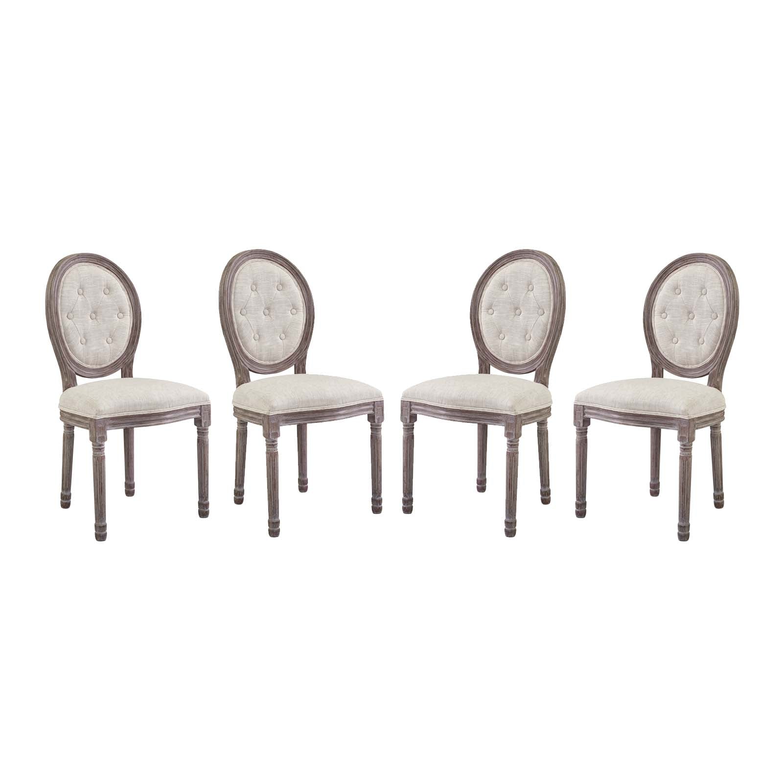 Revel in the whispered opulence of the Arise Dining Side Chair. Featuring a fluted wood frame, button tufted diamond trim, elegant welting, dense foam padding, an upholstered fabric seat, this oval back dining or accent chair elegantly blends old world charm with modern intrigue. Designed with a weathered vintage French look and an undeniable appeal, Arise supports up to 331 pounds and comes with foot pads to preserve flooring. Comes fully assembled. Set Includes: Four - Arise Dining Side Chair