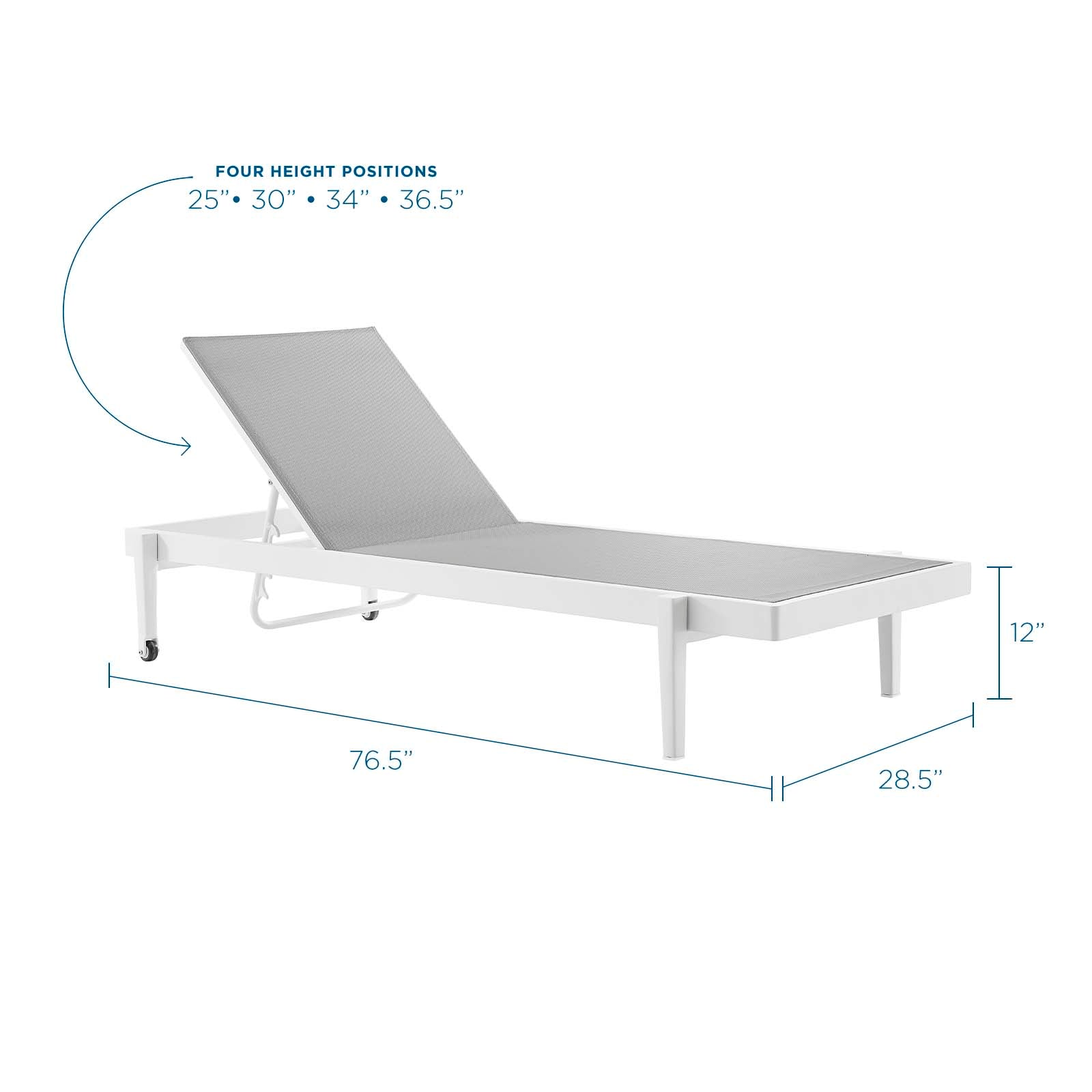 Streamline the style of your outdoor decor with the Charleston Outdoor Patio Aluminum Chaise Lounge Chair. Charleston Patio Lounge Chair has sleek minimalist lines that mix and match with a variety of patio furniture. Height adjustable with three levels, this patio chaise chair personalizes to your needs with ease. Rolling dual wheels allow for effortless custom positioning on your patio, poolside, backyard, deck, or other outdoor seating area. The solidly constructed powder-coated aluminum frame supports up to 341 lbs. All-weather Textilene mesh fabric provides durable support with easy-to-clean usage and allows natural airflow during relaxation. Set Includes: One - Charleston Chaise Lounge Chair