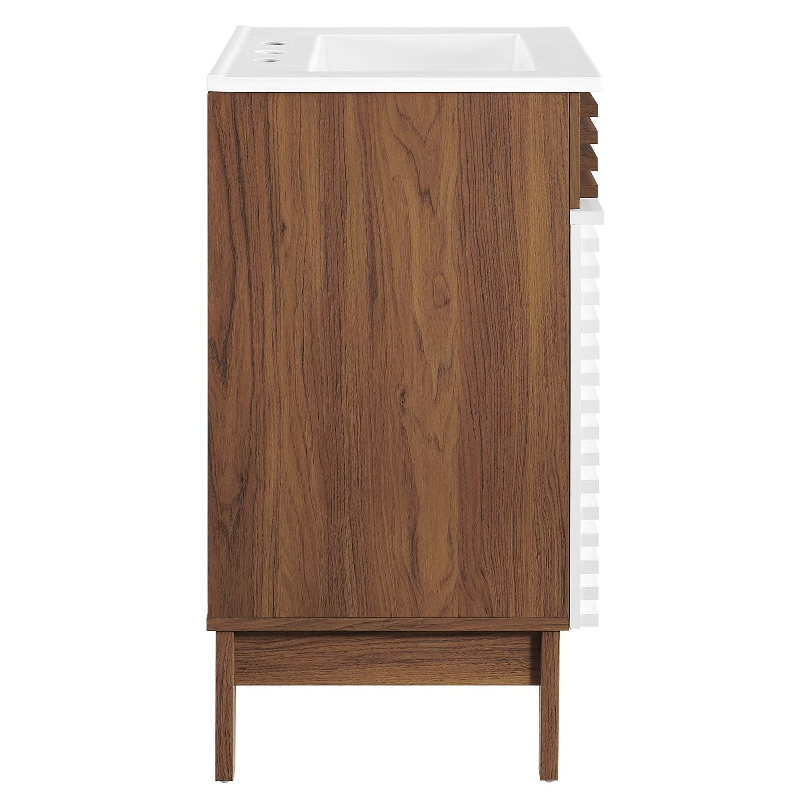 Tap into mid-century aesthetics with the Render Vanity. Render Bathroom Vanity features a durable particleboard frame with smooth walnut grain laminate, four tapered wood legs, and adjustable storage shelf behind two soft-close hinged doors. A curved basin and integrated countertop with three faucet holes create sleek lines and crisp design for an edgy style designed to meet your needs. Boasting a mid-century modern style this vanity features a solid construction with a pleasing look and practical functionality. 8" centerset faucet holes. Assembly required and fixtures not included. Set Includes: One - Render Bathroom Vanity