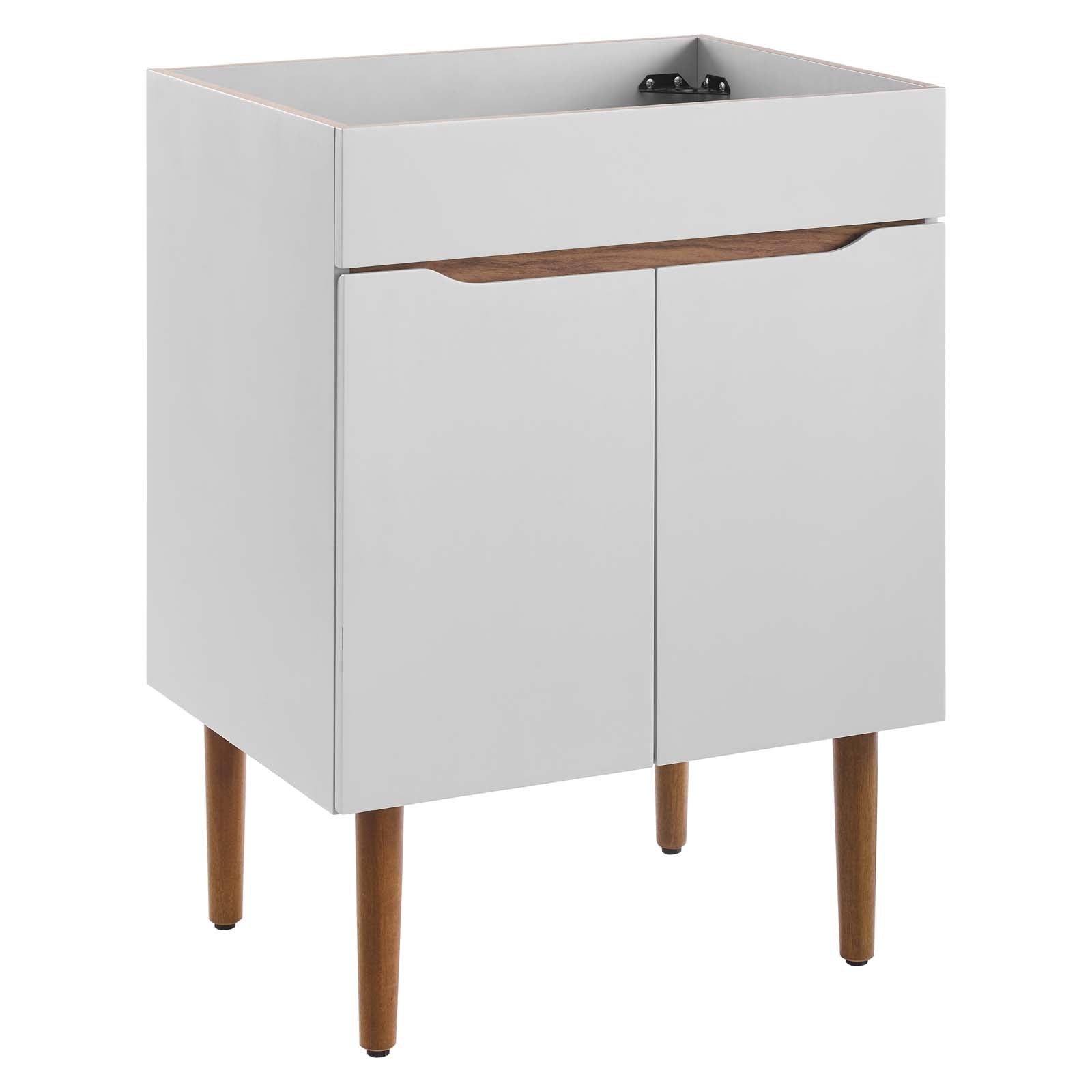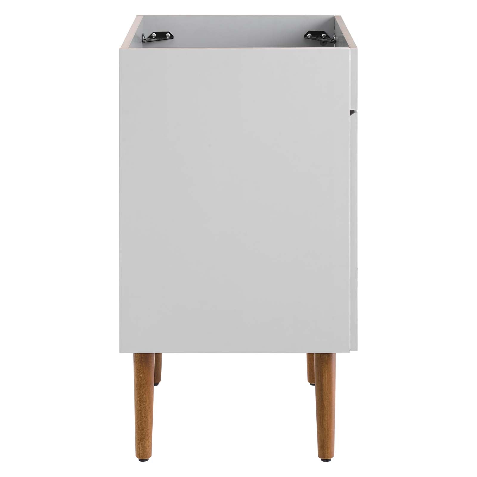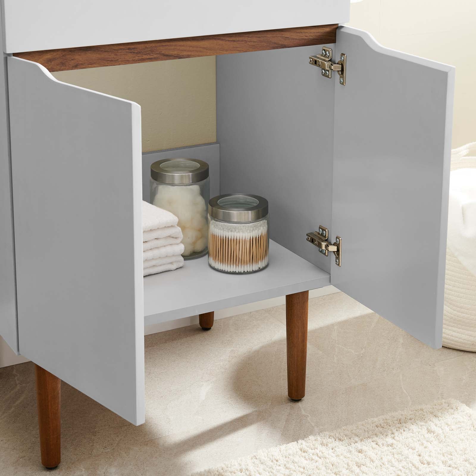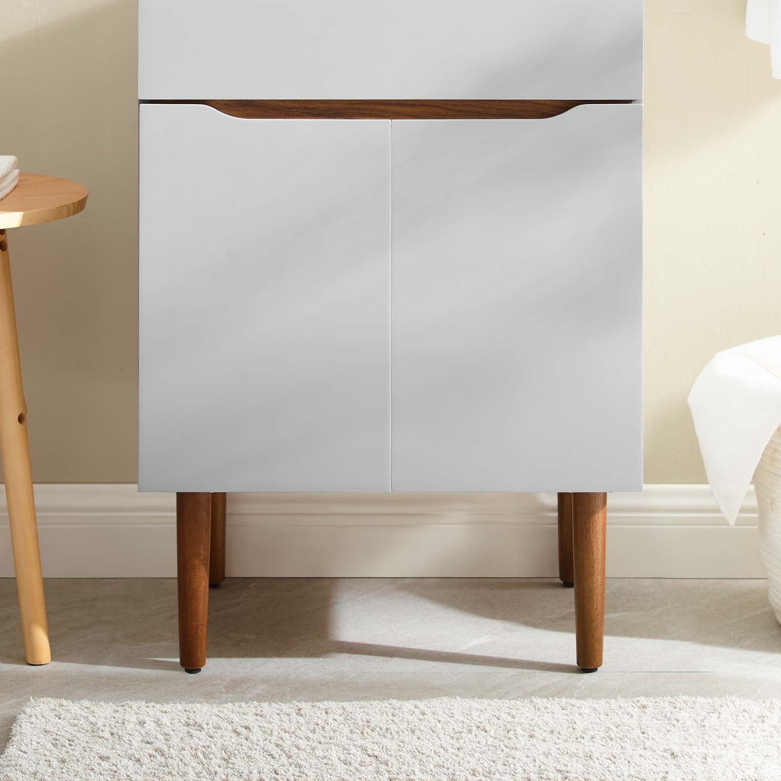 Instill the whispered elegance required to complete your bathroom decor with the Harvest Mid-Century Modern Bathroom Vanity. The Harvest Bathroom Vanity features a durable MDF frame with a matte finish laminate, four tapered mahogany wood legs, and adjustable storage shelf behind two soft-close hinged doors. The sleek look aligns with Scandinavian modern style design for a quietly bold vanity designed for a multitude of decor styles. This vanity features solid construction with a cutaway design on top of the dual doors for easy open and close functionality. Assembly required and sink basin not included. Set Includes: One - Harvest Bathroom Vanity Cabinet