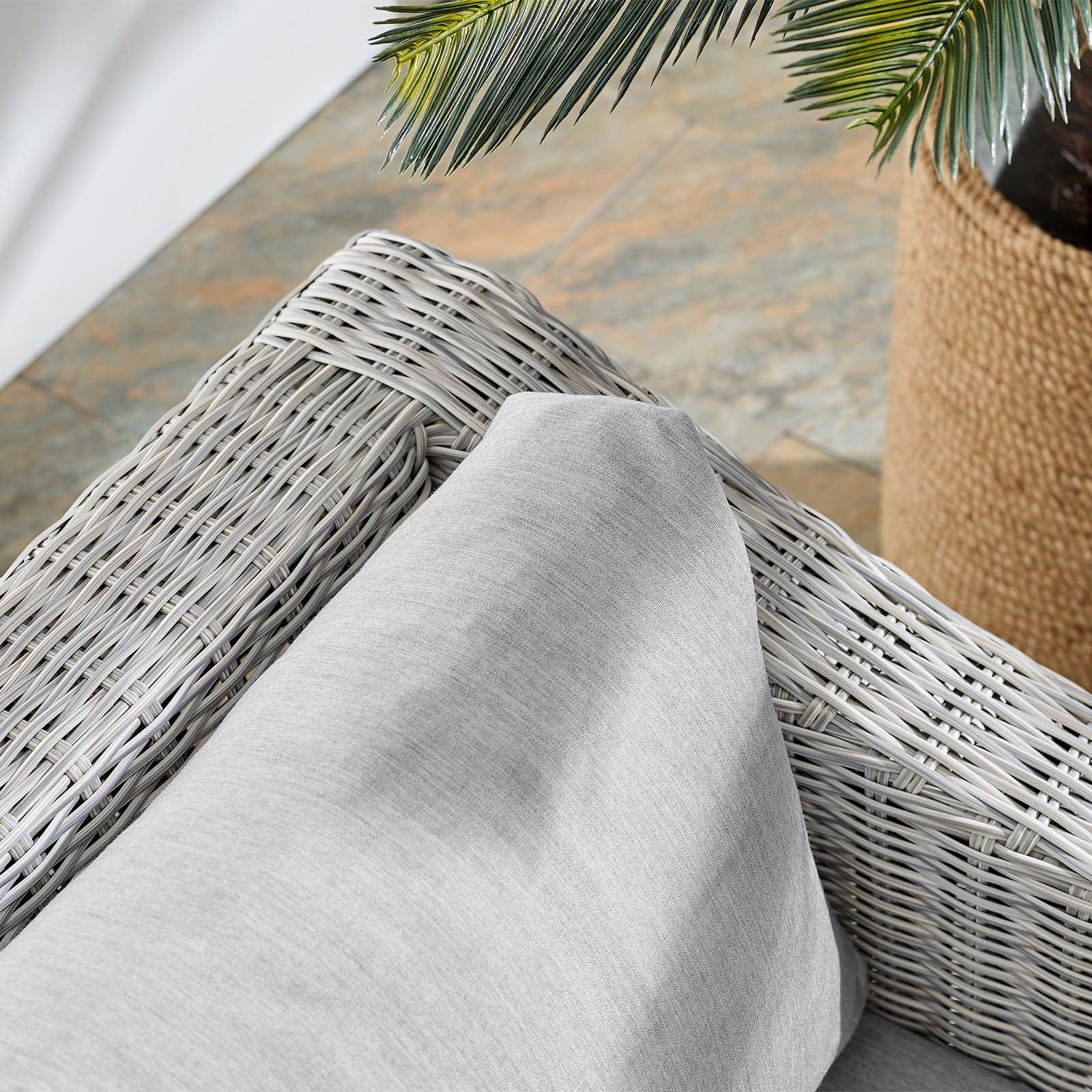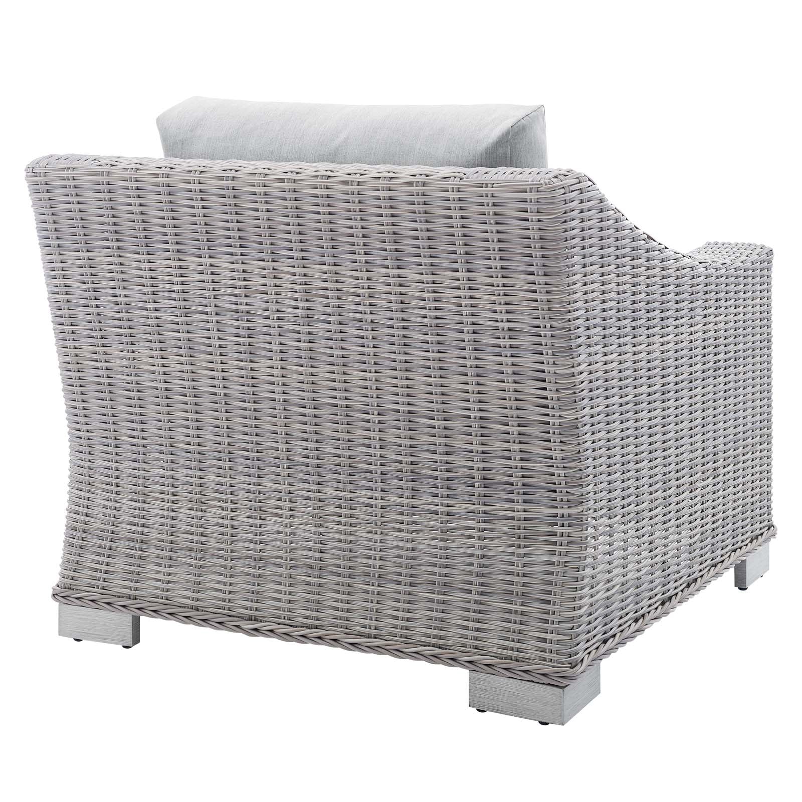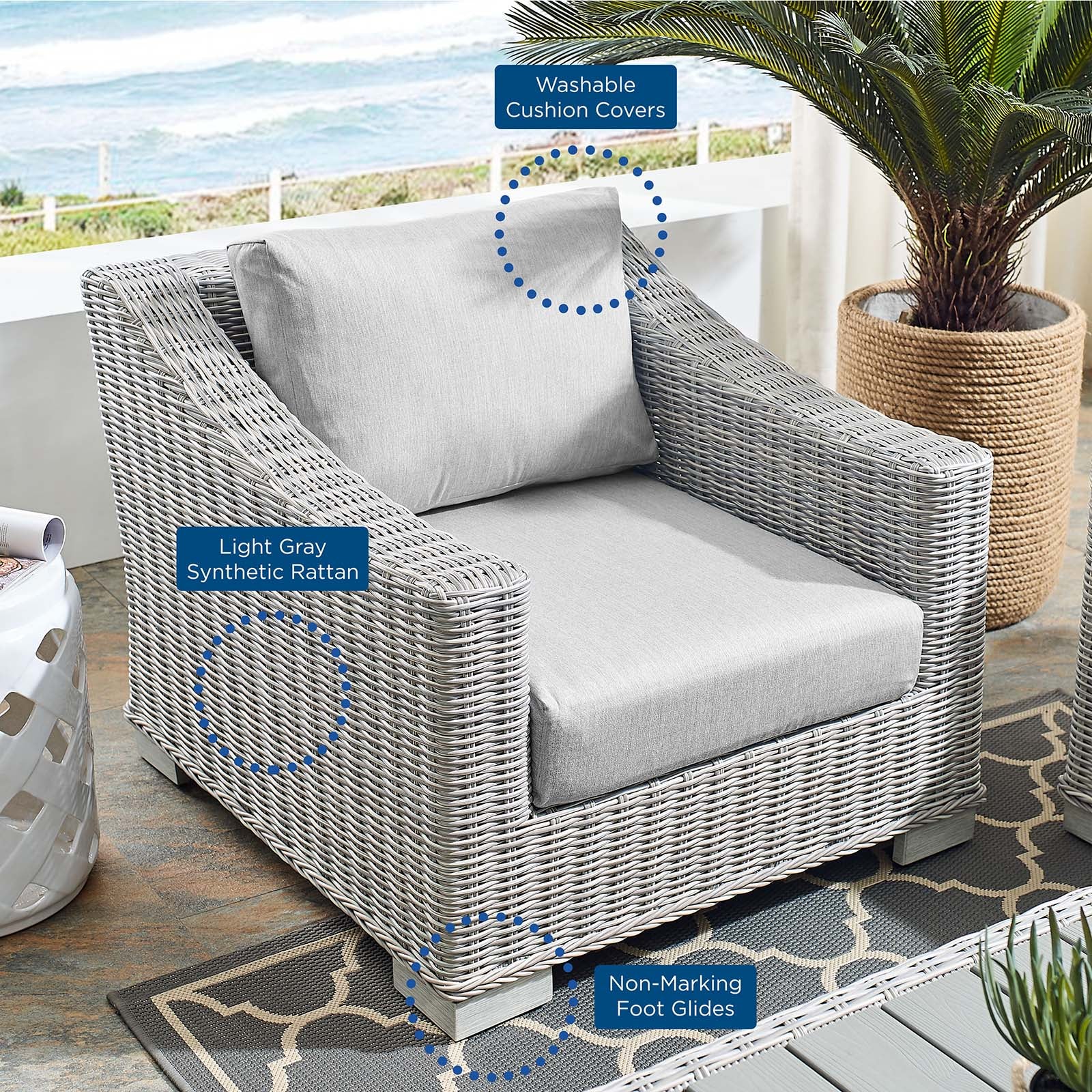 Enjoy fresh air and alfresco relaxation with the Conway Outdoor Patio Wicker Rattan Armchair. Wrapped in UV-resistant light gray synthetic wicker rattan, this patio chair boasts organic texture and a neutral hue that brings a calming presence to your outdoor space. The frame of this outdoor chair is crafted with durable powder-coated aluminum and rests on L-shaped legs with plastic foot glides. Thick foam padded cushions covered with washable water-resistant Sunbrella� fabric covers offer a comfortable seat and affix securely to the lounge chair with cord tension attachments. Trending aesthetics and a classic design define this outdoor patio furniture collection making it a beautiful addition to any outdoor space including the backyard, patio, porch, balcony, or poolside. Assembly required. Patio Chair Weight Capacity: 300 lbs. Set Includes: One - Conway Sunbrella� Armchair