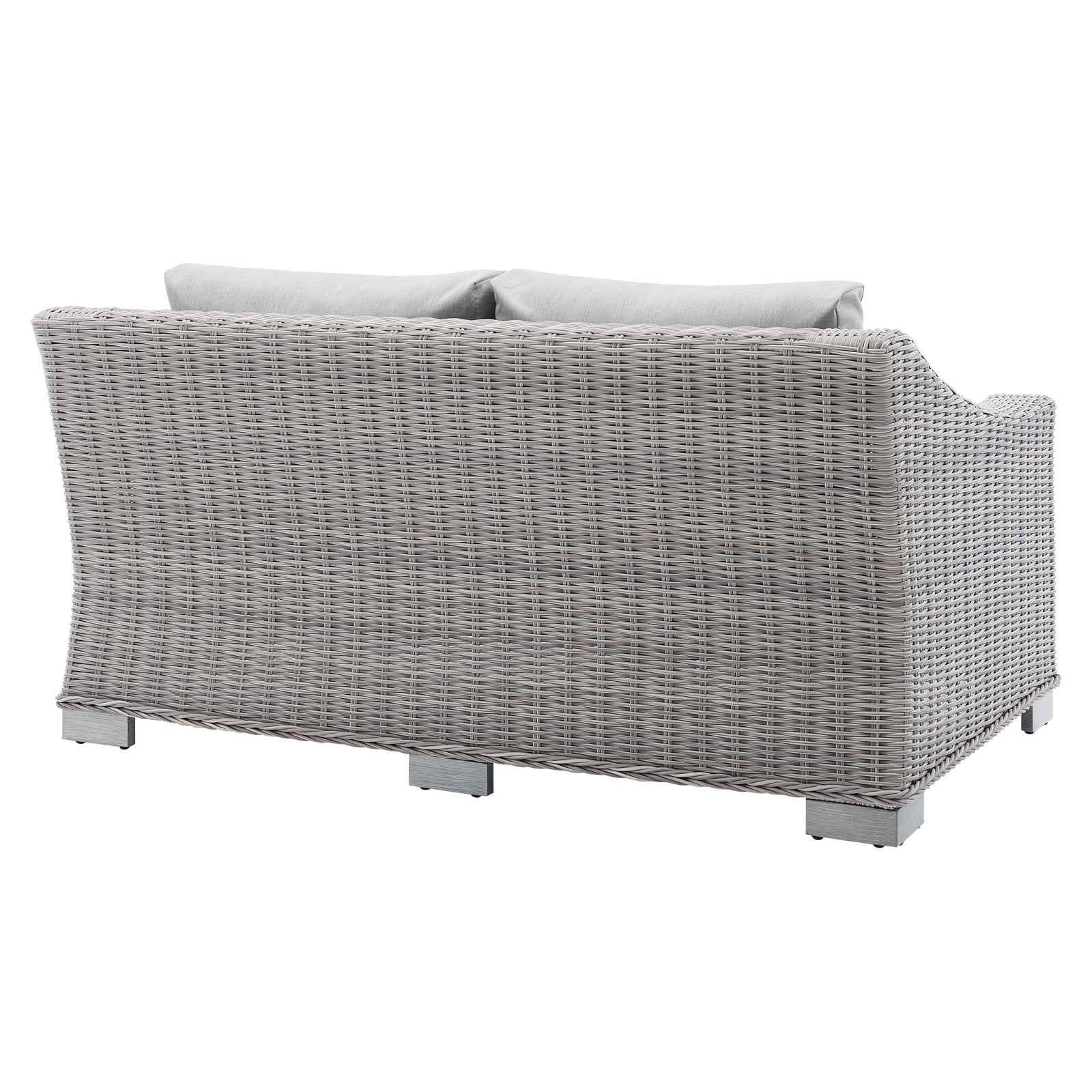 Enjoy fresh air and alfresco relaxation with the Conway Outdoor Patio Wicker Rattan Loveseat. Wrapped in UV-resistant light gray synthetic wicker rattan, this patio loveseat boasts organic texture and a neutral hue that brings a calming presence to your outdoor space. The frame of this outdoor two-seater sofa is crafted with durable powder-coated aluminum and rests on L-shaped legs with plastic foot glides. Thick foam padded cushions covered with washable water-resistant Sunbrella� fabric covers offer a comfortable seat and affix securely to the loveseat with cord tension attachments. Trending aesthetics and a classic design define this outdoor patio furniture collection making it a beautiful addition to any outdoor space including the backyard, patio, porch, balcony, or poolside. Assembly required. Patio Loveseat Weight Capacity: 600 lbs. Set Includes: One - Conway Sunbrella� Loveseat