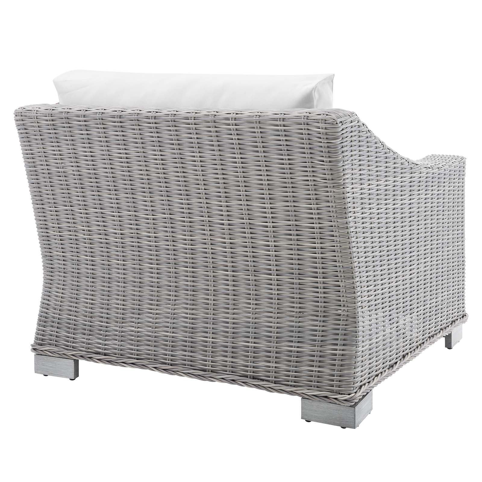 Enjoy fresh air and alfresco relaxation with the Conway Outdoor Patio Wicker Rattan Left-Arm Sectional Sofa Chair. Wrapped in UV-resistant light gray synthetic wicker rattan, this sectional sofa piece boasts organic texture and a neutral hue that brings a calming presence to your outdoor area with a modular design that adapts to variety of configurations to suit your space. The frame of this outdoor chair is crafted with durable powder-coated aluminum and rests on L-shaped legs with plastic foot glides. Thick foam padded cushions covered with washable water-resistantSunbrella fabric covers offer a comfortable seat and affix securely to the left-arm chair with cord tension attachments. Trending aesthetics and a classic design define this outdoor patio furniture collection making it a beautiful addition to any outdoor space including the backyard, patio, porch, balcony, or poolside. Assembly required. Patio Chair Weight Capacity: 300 lbs. Set Includes: One - ConwaySunbrella Left-Arm Chair