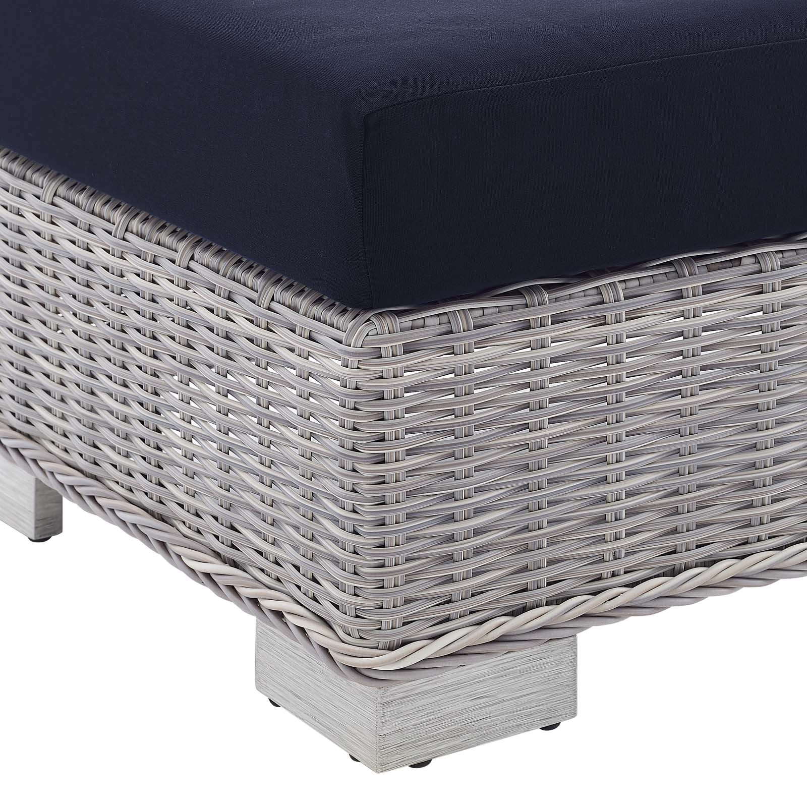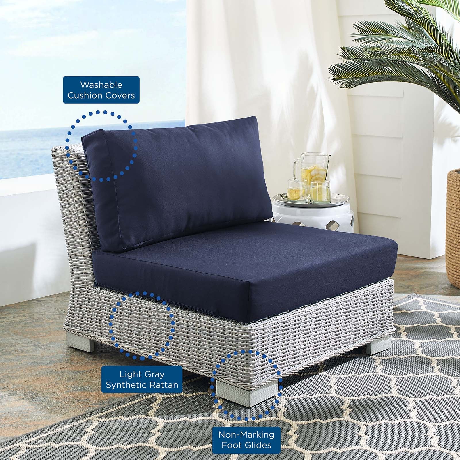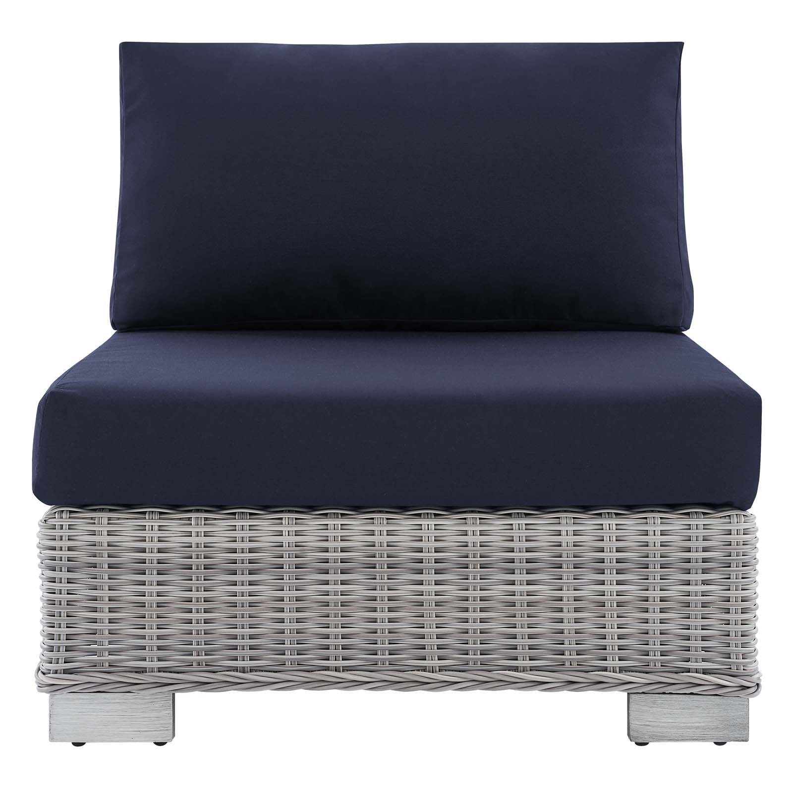 Enjoy fresh air and alfresco relaxation with the Conway Outdoor Patio Wicker Rattan Armless Chair. Wrapped in UV-resistant light gray synthetic wicker rattan, this patio chair boasts organic texture and a neutral hue that brings a calming presence to your outdoor space. The frame of this outdoor armless chair is crafted with durable powder-coated aluminum and rests on L-shaped legs with plastic foot glides. Thick foam padded cushions covered with washable water-resistant Sunbrella� fabric covers offer a comfortable seat and affix securely to the lounge chair with cord tension attachments. Trending aesthetics and a classic design define this outdoor patio furniture collection making it a beautiful addition to any outdoor space including the backyard, patio, porch, balcony, or poolside. Assembly required. Patio Armless Chair Weight Capacity: 300 lbs. Set Includes: One - Conway Sunbrella� Armless Chair