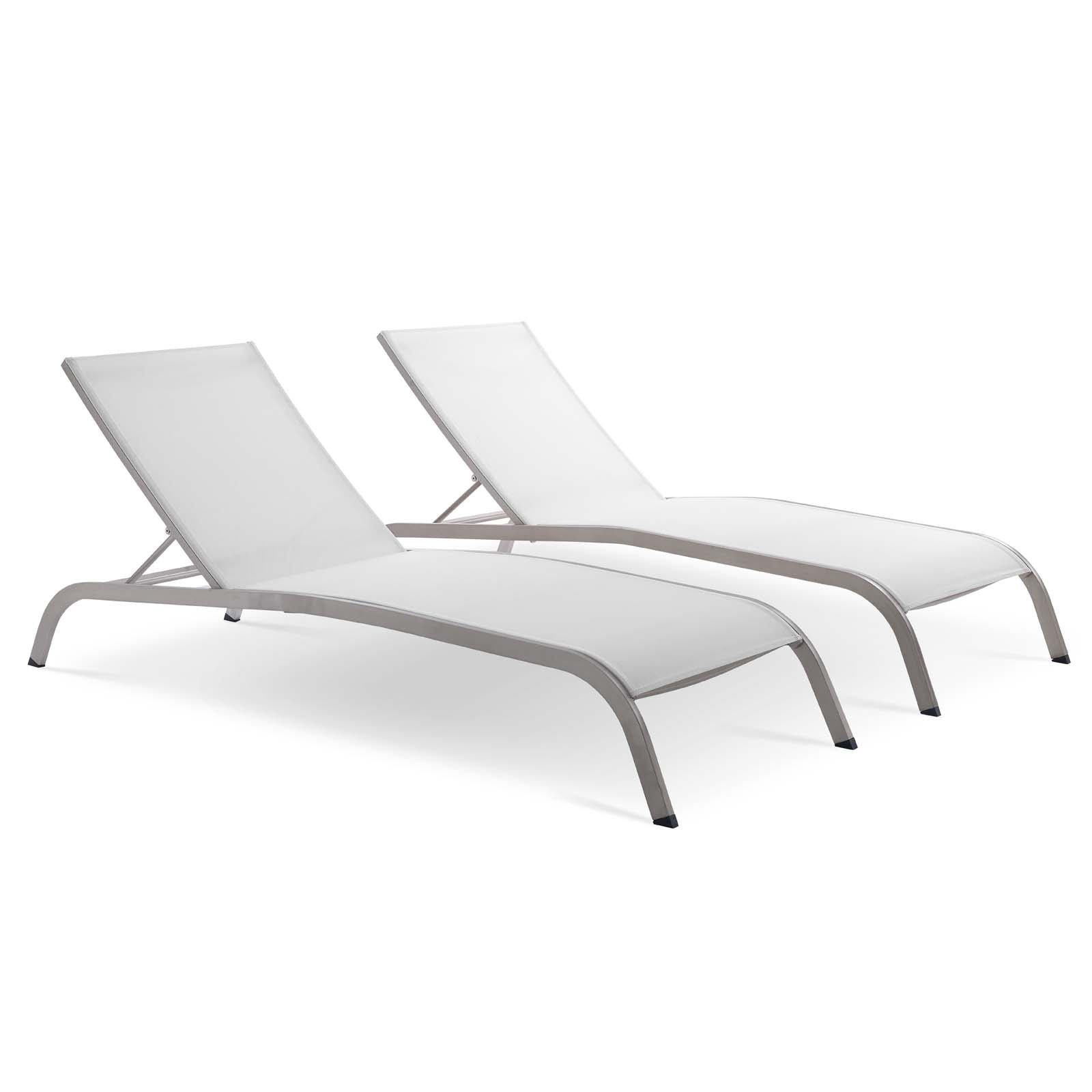 Energize your patio decor with the versatile vintage glamour Savannah Outdoor Patio Mesh Chaise Lounge Chair Set of 2. A sleek design that evokes a retro-modern feel, Savannah features all-weather Textilene mesh fabric that creates a breathable fabric for a pleasant outdoor lounging experience. Complete with an anodized matte aluminum frame with non-marking foot caps, Savannah is a deceptively simple piece creates an aura of vintage glamour in your patio decor. This set of elegant outdoor sun loungers is a perfect addition to the backyard, poolside, porch, deck, or balcony. Chair Weight Capacity: 661 lbs. Set Includes: Two - Savannah Outdoor Patio Mesh Chaise Lounge Chair