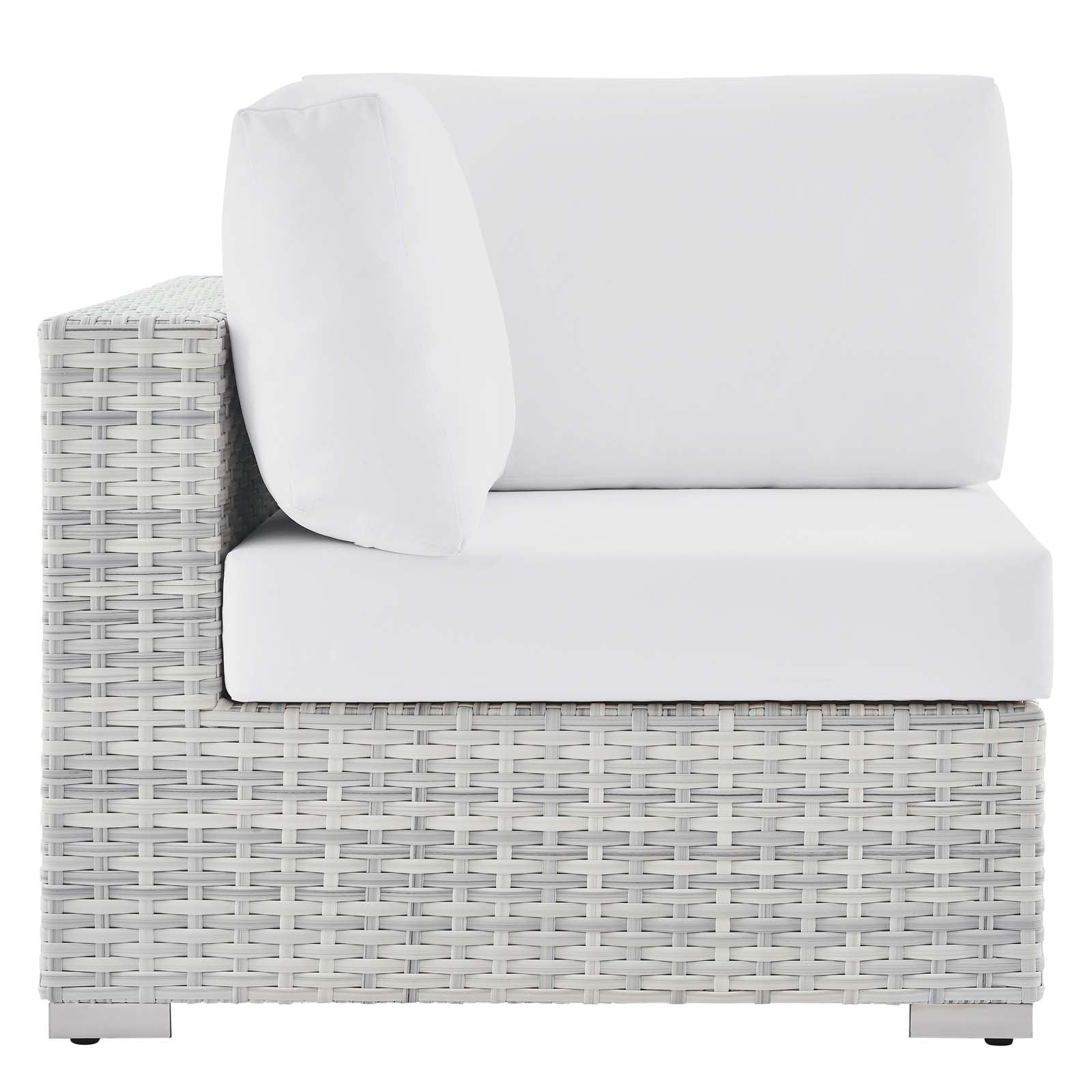 Gather stages of sensitivity with the Convene Outdoor Sectional series. Made with a synthetic rattan weave and a powder-coated aluminum frame, Convene is a versatile corner armchair from an outdoor collection that shifts and combines according to the spontaneous needs of the moment. Outfitted with all-weather fabric cushions, the Convene Corner Chair leaves a positive impression on friends and family while enhancing your patio, backyard, or poolside retreat with palpable distinction. Set Includes: One - Convene Corner Chair