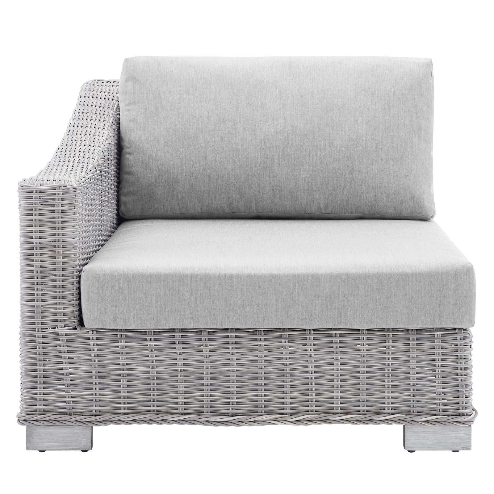 Enjoy fresh air and alfresco relaxation with the Conway Outdoor Patio Sunbrella� Wicker Rattan 9-Piece Sectional Sofa Furniture Set. Wrapped in UV-resistant light gray synthetic wicker rattan, this outdoor sectional sofa boasts organic texture and a neutral hue that brings a calming presence to your outdoor area with a modular design that adapts to variety of configurations to suit your space. The frames of this outdoor sofa set are crafted with durable powder-coated aluminum and rest on L-shaped legs with plastic foot glides. Thick foam padded cushions covered with washable water-resistant Sunbrella� covers offer a comfortable seat and affix securely to the patio sofa with cord tension attachments. Trending aesthetics and a classic design define this outdoor patio furniture collection making it a beautiful addition to any outdoor space including the backyard, patio, porch, balcony, or poolside. Assembly required. Set Includes: Corner Chair, Left-Arm Chair, Right-Arm Chair, 3 Armless Chairs, 2 Armchairs, Coffee Table Set Includes: One - Conway 45" Coffee Table One - Conway Sunbrella� Corner Chair One - Conway Sunbrella� Left-Arm Chair One - Conway Sunbrella� Right-Arm Chair Three - Conway Sunbrella� Armless Chair Two - Conway Sunbrella� Armchair
