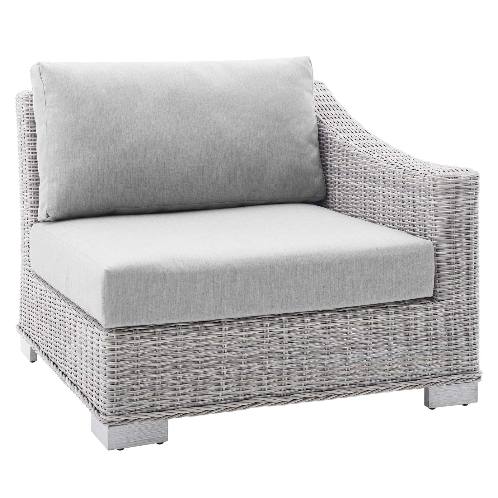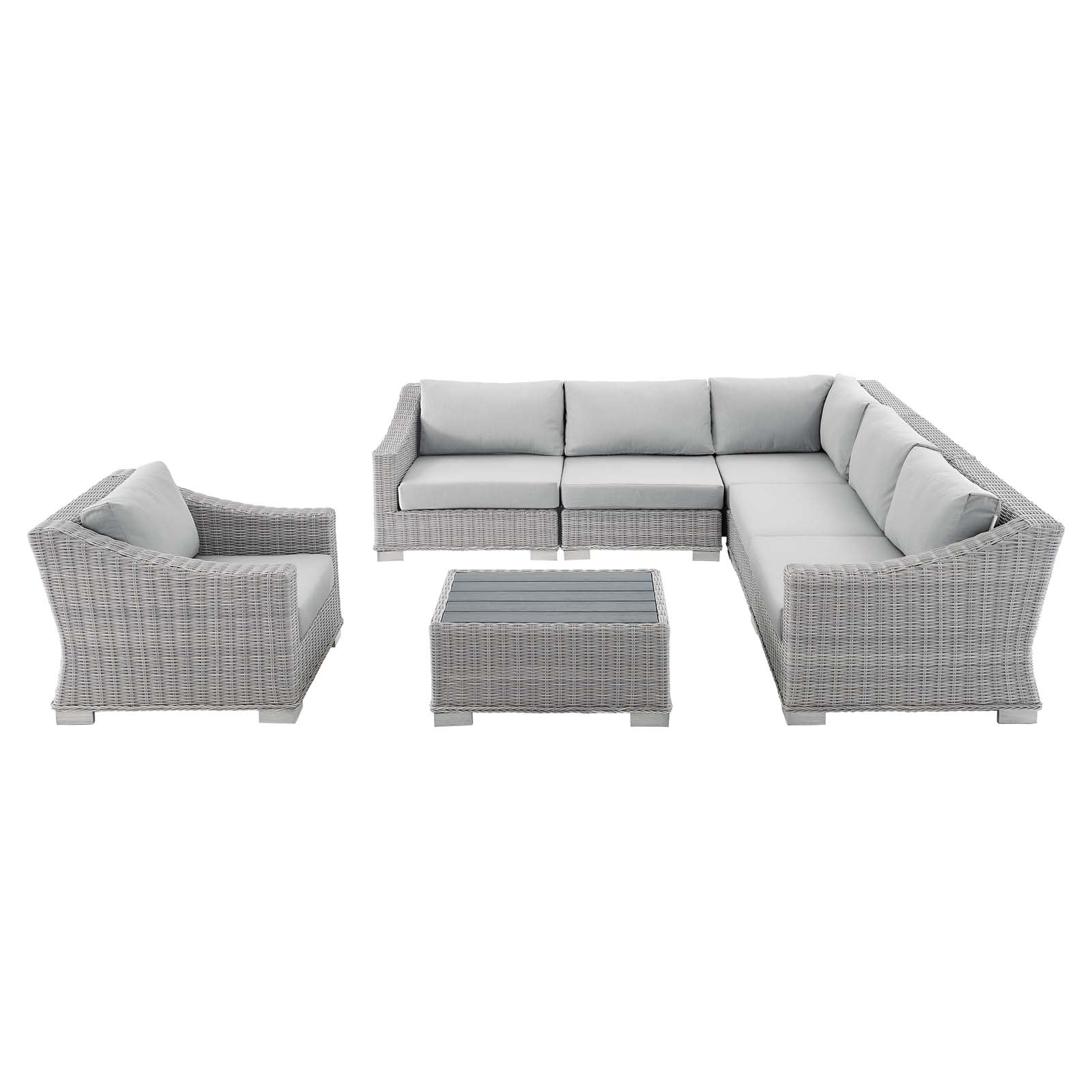 Enjoy fresh air and alfresco relaxation with the Conway Outdoor Patio Sunbrella� Wicker Rattan 7-Piece Sectional Sofa Furniture Set. Wrapped in UV-resistant light gray synthetic wicker rattan, this outdoor sectional sofa boasts organic texture and a neutral hue that brings a calming presence to your outdoor area with a modular design that adapts to variety of configurations to suit your space. The frames of this outdoor sofa set are crafted with durable powder-coated aluminum and rest on L-shaped legs with plastic foot glides. Thick foam padded cushions covered with washable water-resistant Sunbrella� covers offer a comfortable seat and affix securely to the patio sofa with cord tension attachments. Trending aesthetics and a classic design define this outdoor patio furniture collection making it a beautiful addition to any outdoor space including the backyard, patio, porch, balcony, or poolside. Assembly required. Set Includes: Corner Chair, Left-Arm Chair, Right-Arm Chair, 2 Armless Chairs, Armchair, Coffee Table Set Includes: One - Conway 32" Coffee Table One - Conway Sunbrella� Armchair One - Conway Sunbrella� Corner Chair One - Conway Sunbrella� Left-Arm Chair One - Conway Sunbrella� Right-Arm Chair Two - Conway Sunbrella� Armless Chair