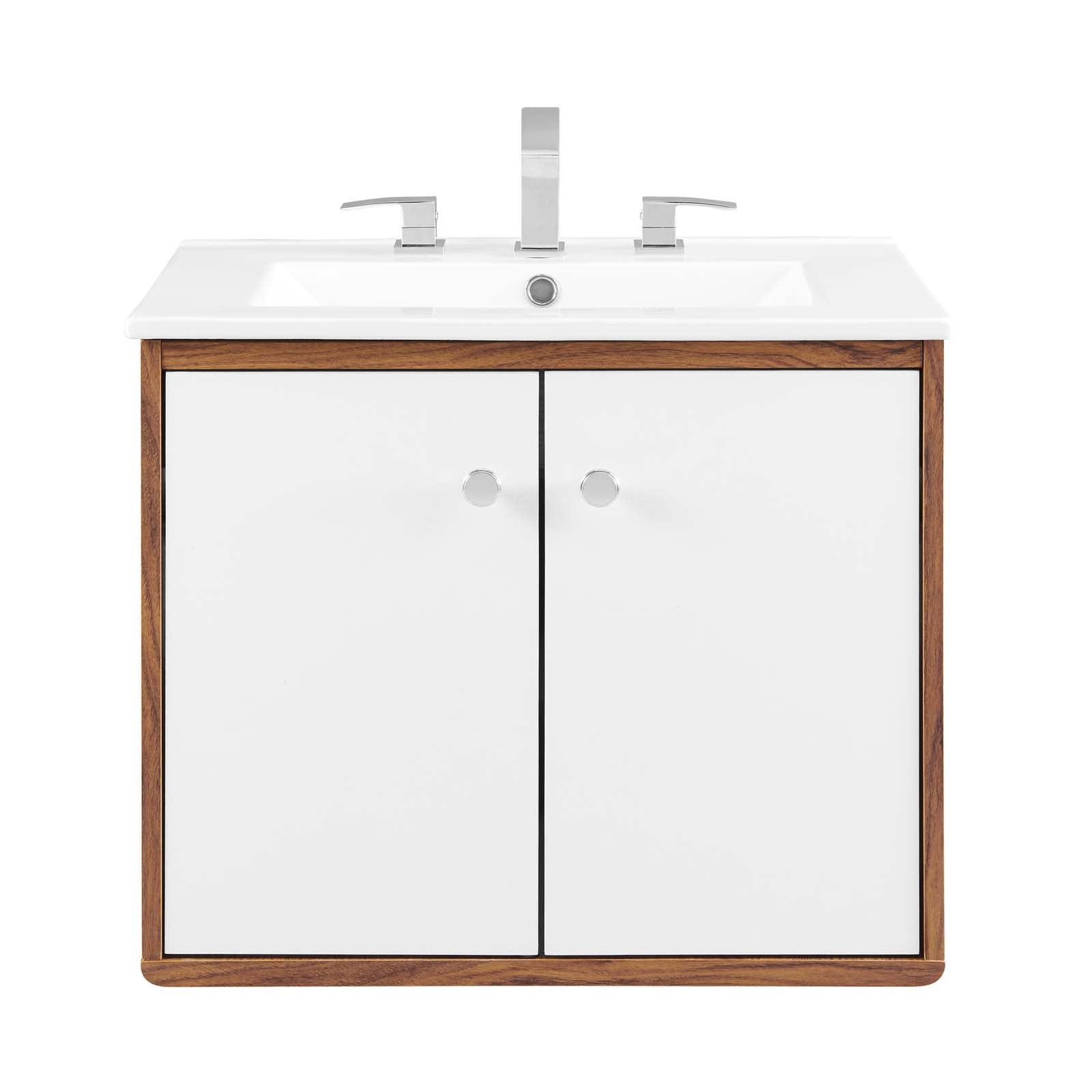 Bring mid-century modern aesthetics into the bathroom with the Transmit 24" Bathroom Vanity. This vanity features a durable particleboard and walnut grain veneer construction with ample storage space for all your bathroom essentials behind two white lacquered soft-close hinged doors. A ceramic sink with an integrated countertop, 8" centerset, and rectangular sink basin continue the sleek look of this retro modern vanity. Complete with chrome knobs, this bathroom vanity mounts directly to the wall saving a substantial amount of floor space. Assembly required and sink fixtures not included. Set Includes: One - Transmit 24" Wall-Mount Bathroom Vanity