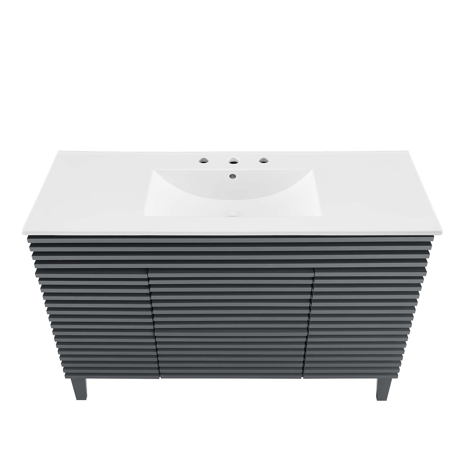Tap into mid-century aesthetics with the Render Vanity. The Render 48" Bathroom Vanity features a durable MDF and particleboard frame with smooth walnut grain laminate, four tapered wood legs, and ample under sink storage space in full-extension drawers and behind soft-close hinged doors. Crafted with ceramic, a single sink with an integrated countertop, 8" widespread, and rectangular sink basin continue the sleek look of this retro modern vanity. Clean lines and crisp design align for an edgy style designed to meet your needs. Boasting a mid-century modern style this vanity features a solid construction with a pleasing look and practical functionality. Assembly required and fixtures not included. Set Includes: One - Render 48" Single Sink Bathroom Vanity